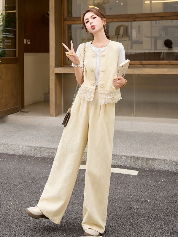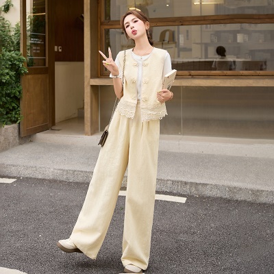 商品名称:小香风蕾丝花边亚麻套装女2025夏季新款时尚洋气巨好看马甲三件套