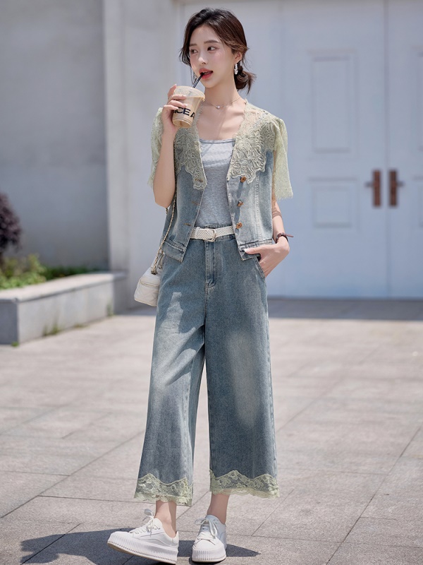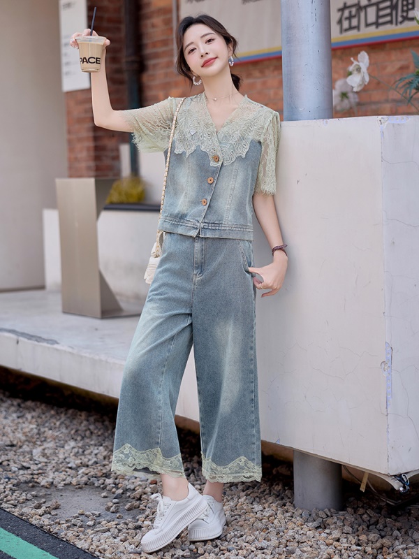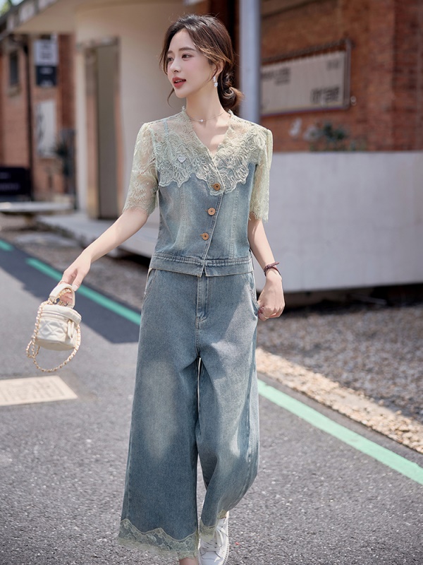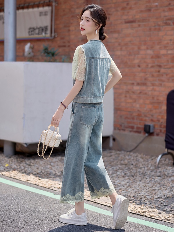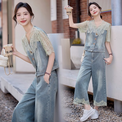商品名称:小香风蕾丝套装女2025夏日新款小个子时尚巨好看天丝牛仔三件套裤