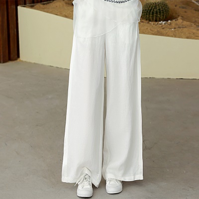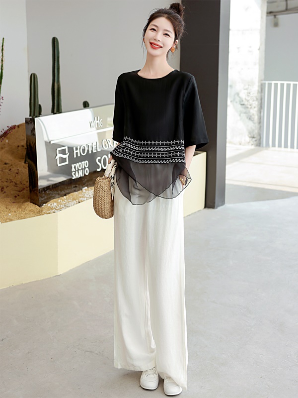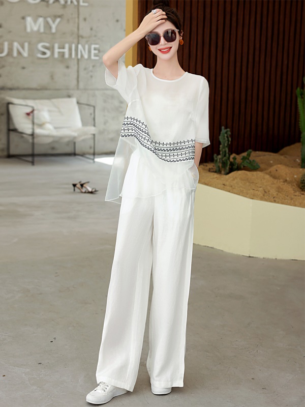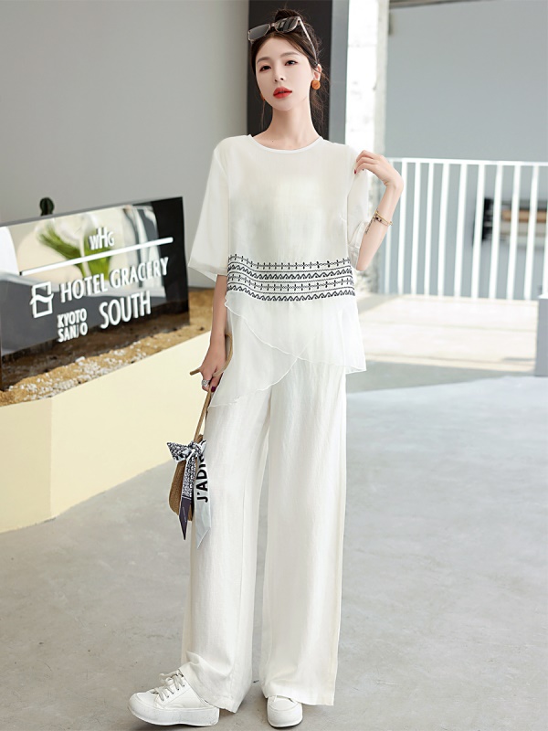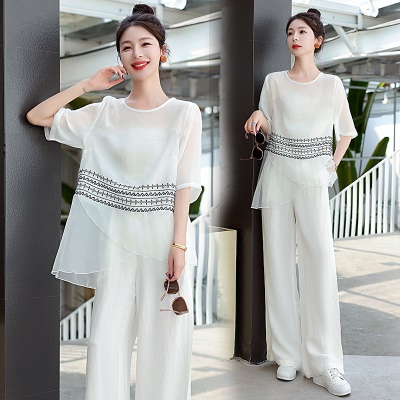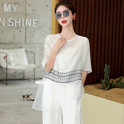 时尚中袖棉麻套装女夏新款高端刺绣天丝网纱上衣亚麻阔腿裤两件套