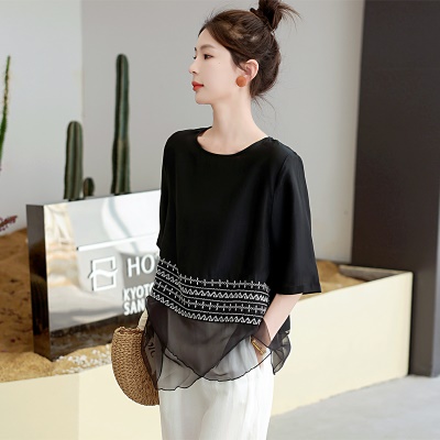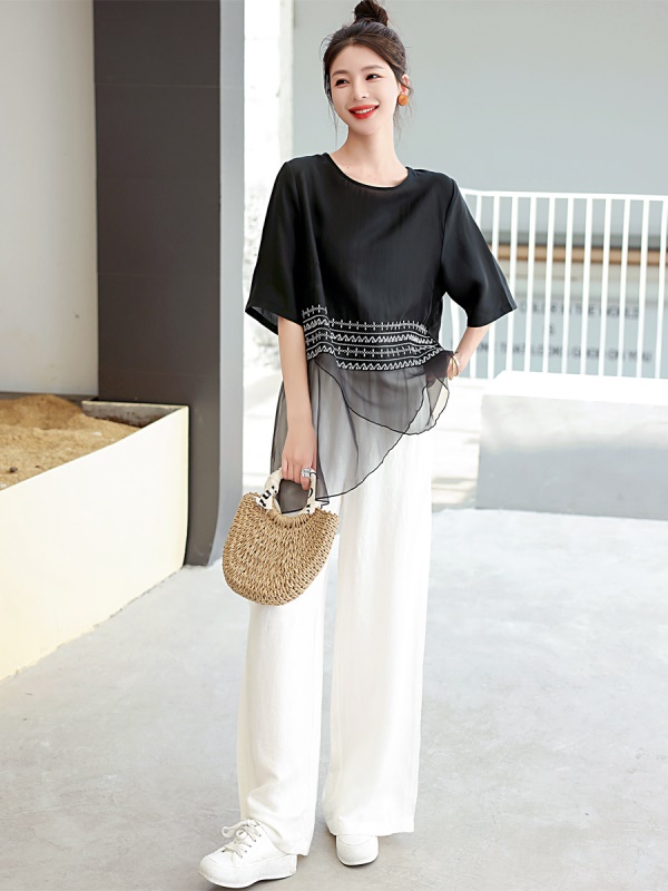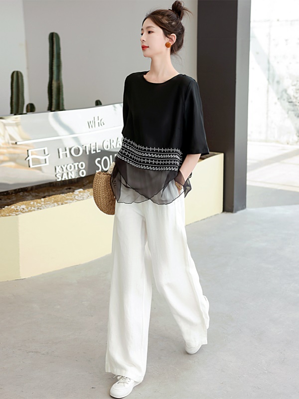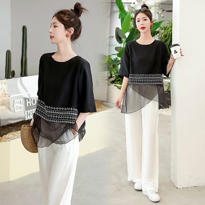 商品名称:时尚中袖棉麻套装女夏新款高端刺绣天丝网纱上衣亚麻阔腿裤两件套