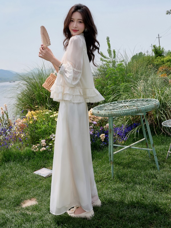 小香风荷叶边雪纺套装女2025夏季新款时尚减龄独特阔腿裙裤两件套