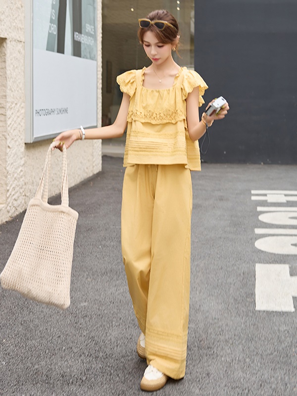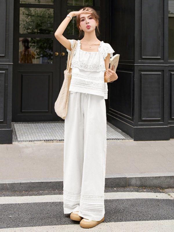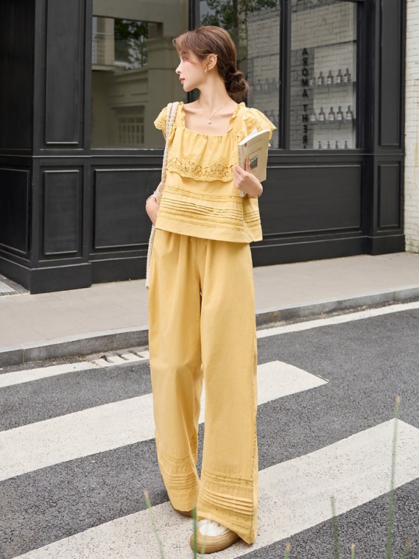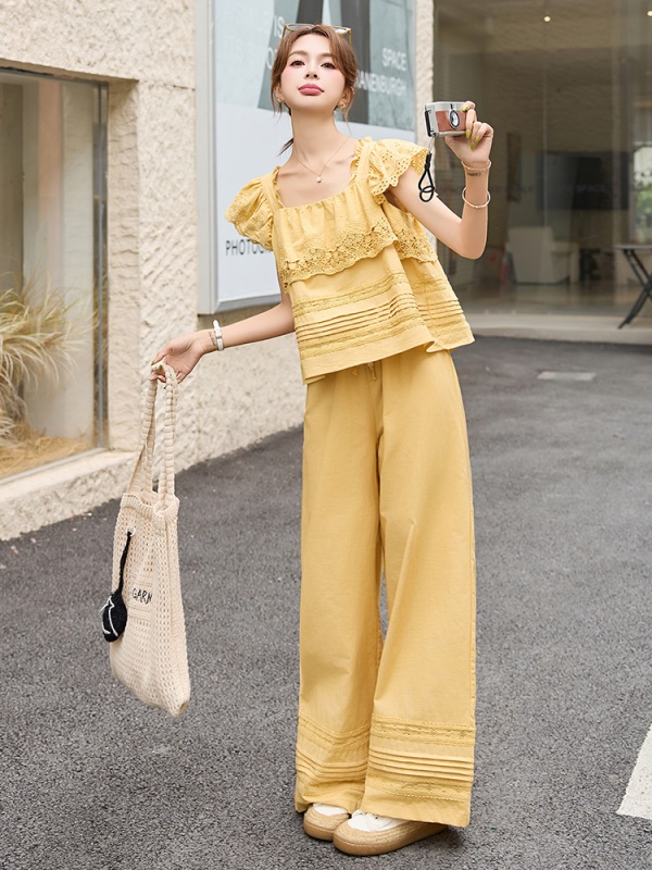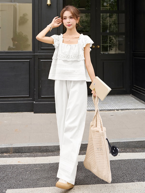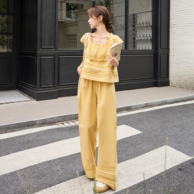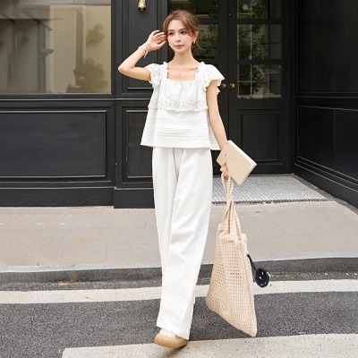 商品名称:法式飞飞袖亚麻套装女2025夏季新款时尚方领蕾丝钩花休闲裤两件套