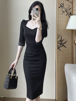 黑色职业中袖包臀连衣裙早秋新款女装高级感赫本风修身显瘦小黑裙