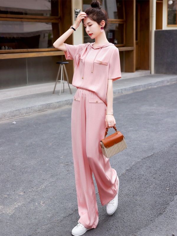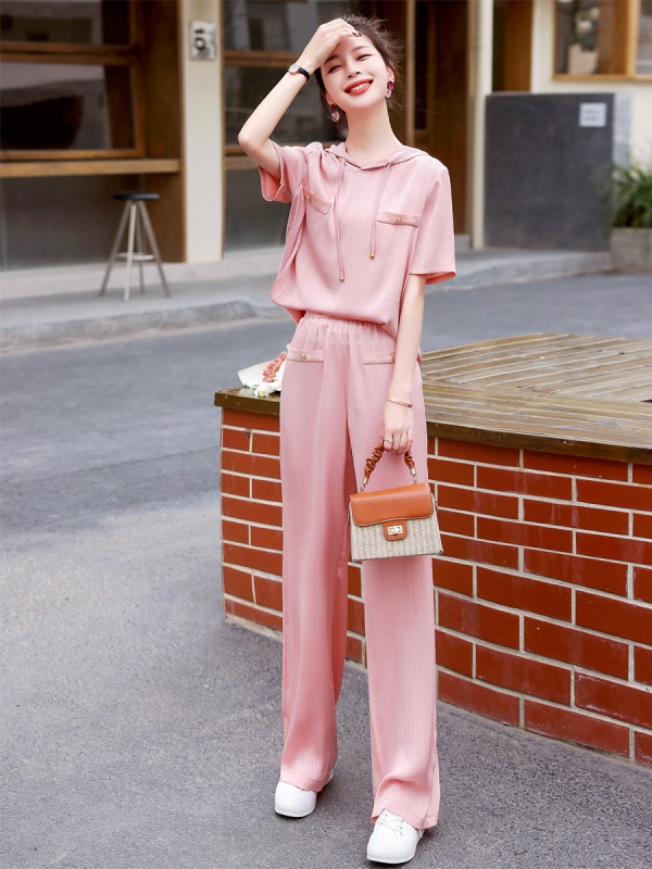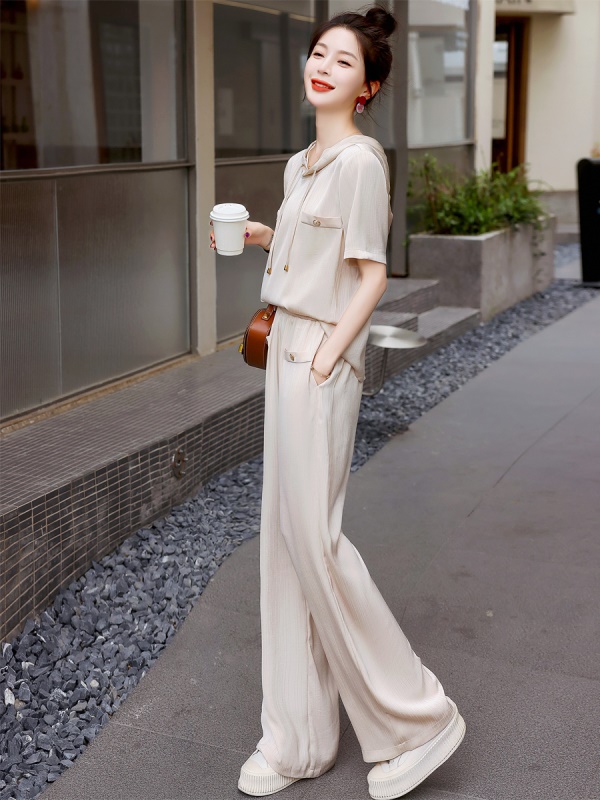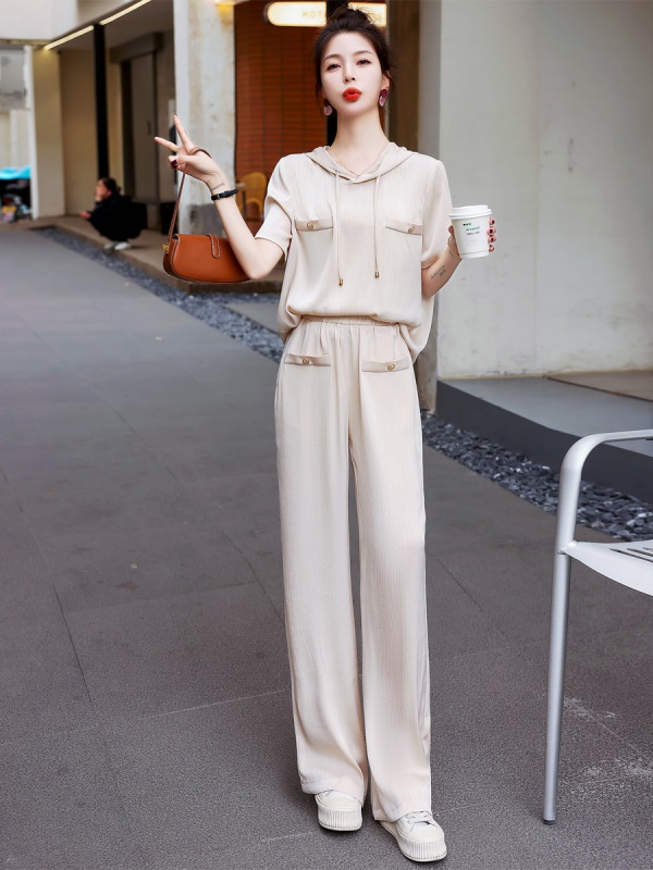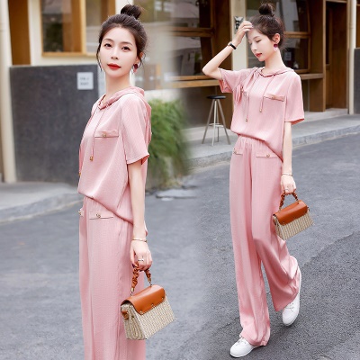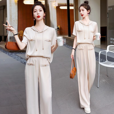 商品名称:高端休闲时尚套装女夏2025新款气质冰丝运动连帽显瘦阔腿裤两件套