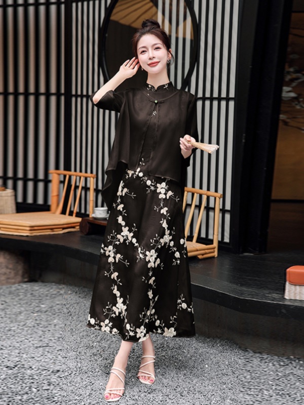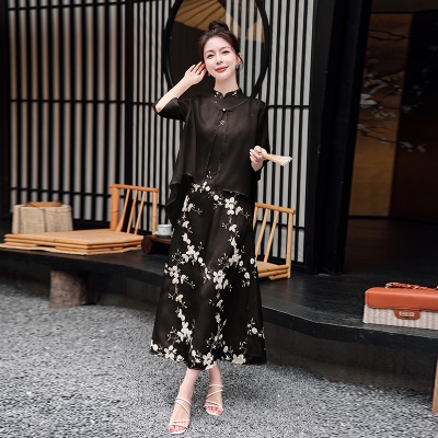 新中式国风时尚套装裙子女夏新款修身显瘦黑色水墨画半身裙两件套