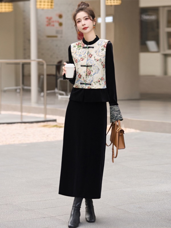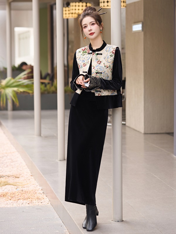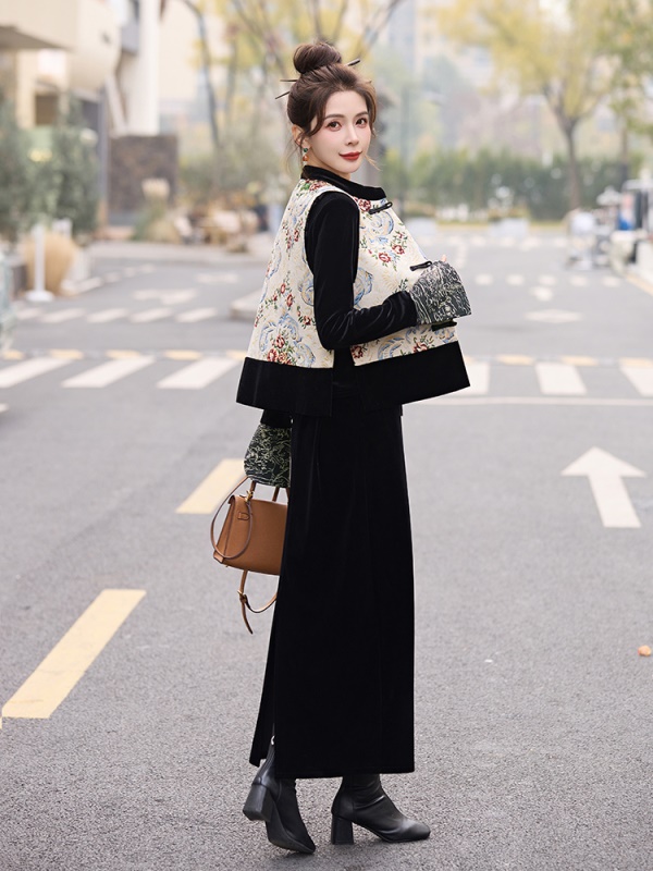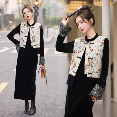 商品名称:新中式国风套装裙女2025春季新款端庄大气高档丝绒刺绣马甲三件套