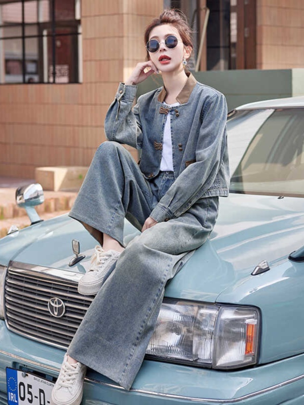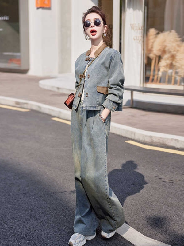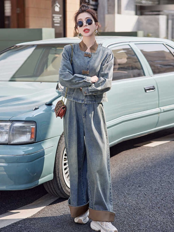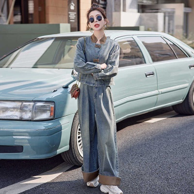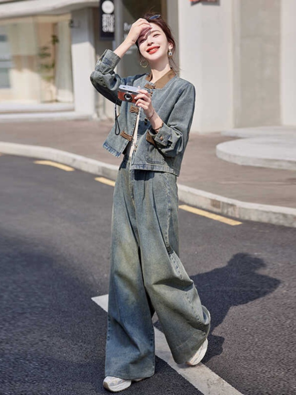 牛仔外套女2025新款爆款春季百搭套装新中式国风盘扣阔腿裤两件套