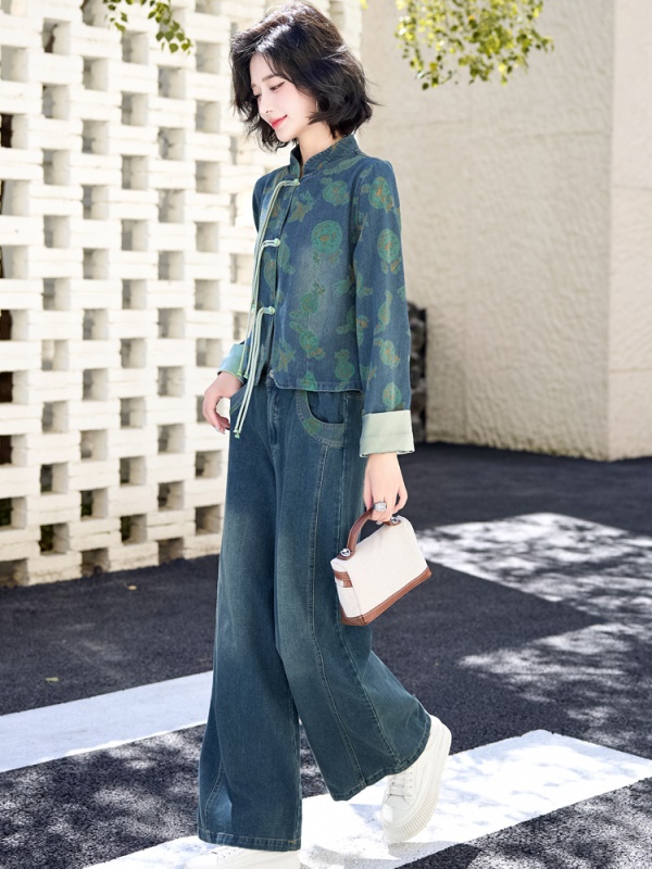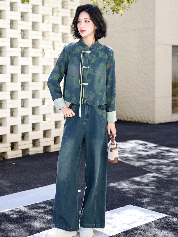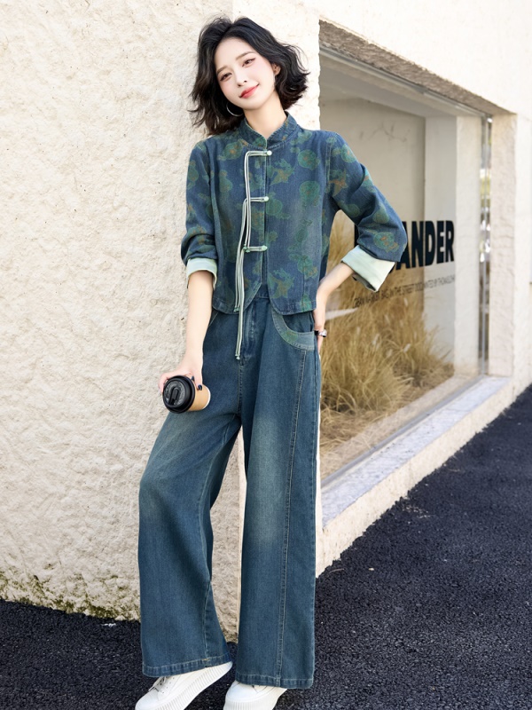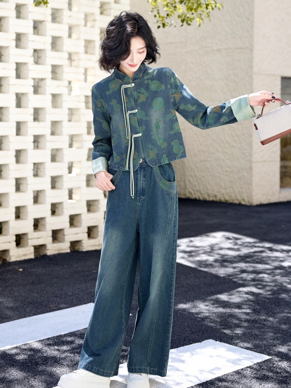 新中式牛仔阔腿裤套装女2025秋装新款时尚休闲立领欧货盘扣两件套