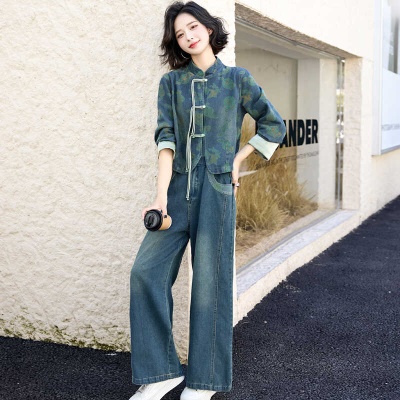 商品名称:新中式牛仔阔腿裤套装女2025秋装新款时尚休闲立领欧货盘扣两件套