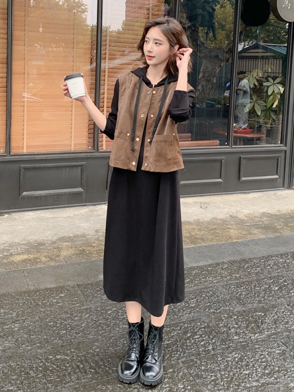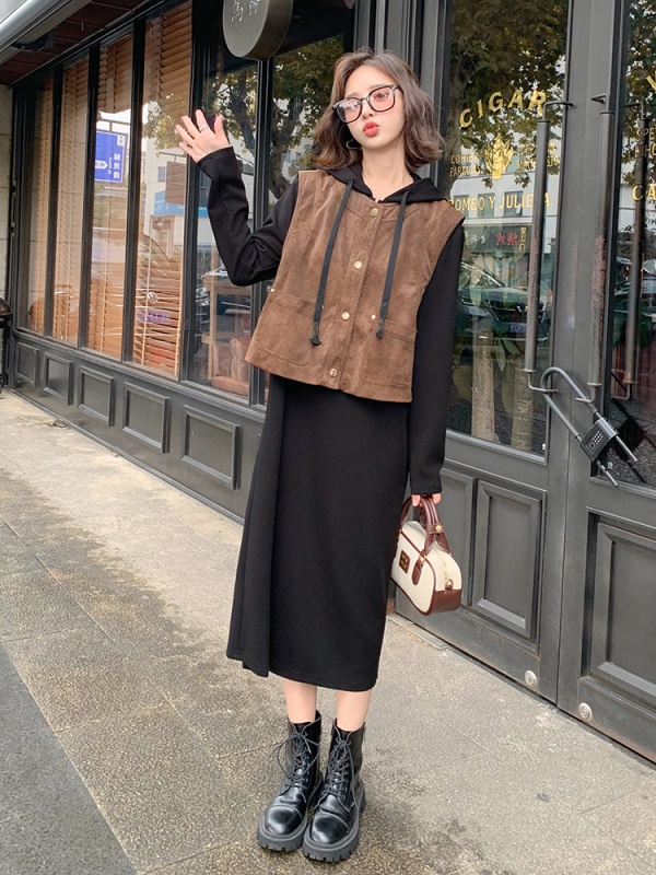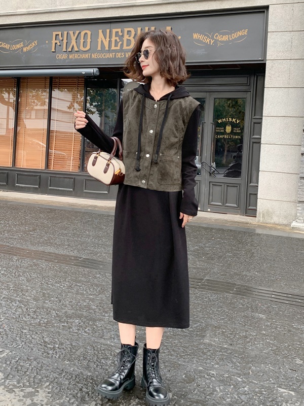 商品名称:欧货连帽卫衣连衣裙套装女2025秋装新款时尚减龄学院风马甲两件套