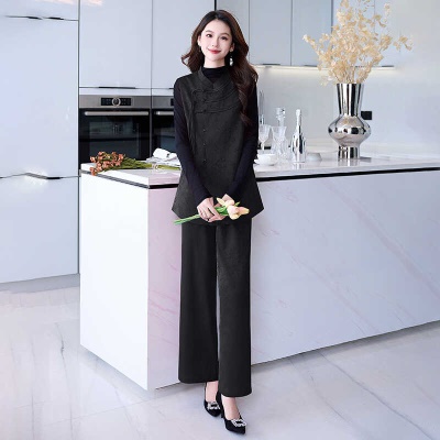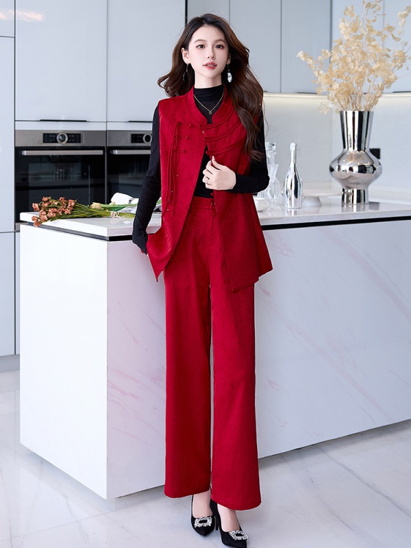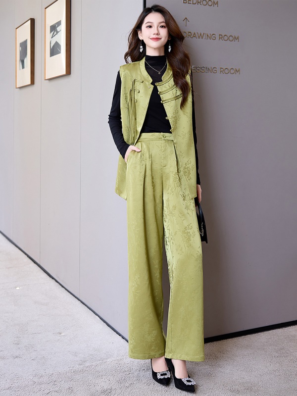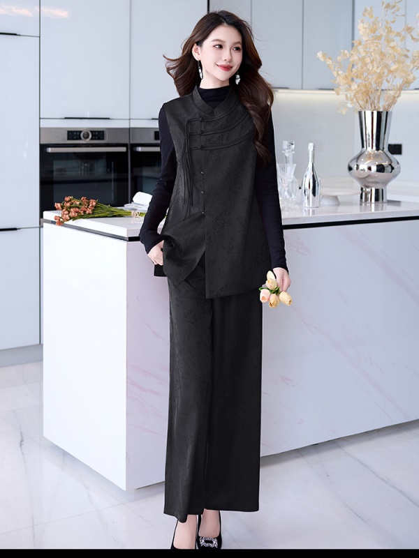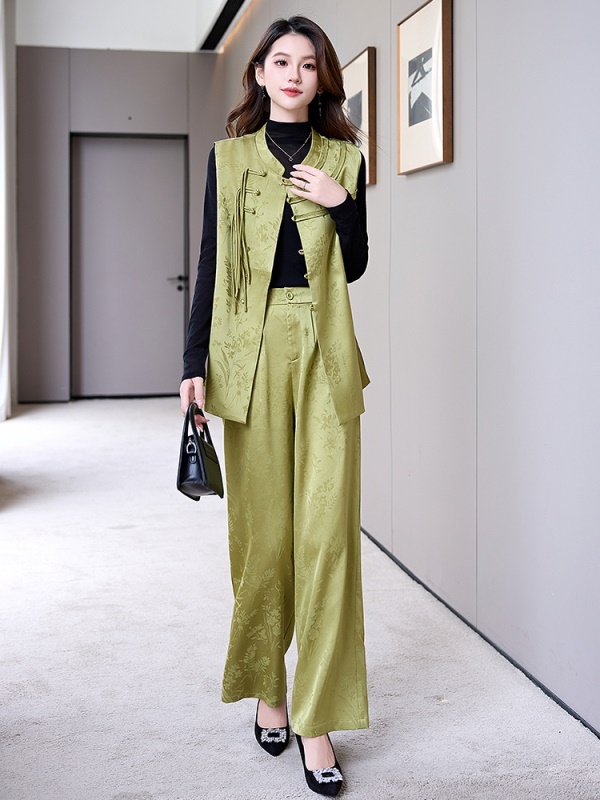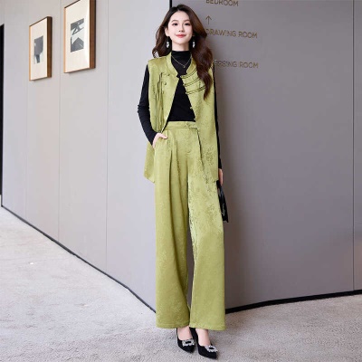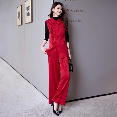 商品名称:新中式国风套装女2025秋季新款高端盘扣流苏无袖马甲阔腿裤三件套