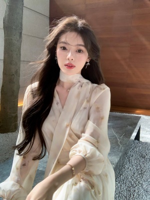 ByYou 夏季新款高级感茶歇飘带v领黄色碎花连衣裙收腰泡泡袖长裙