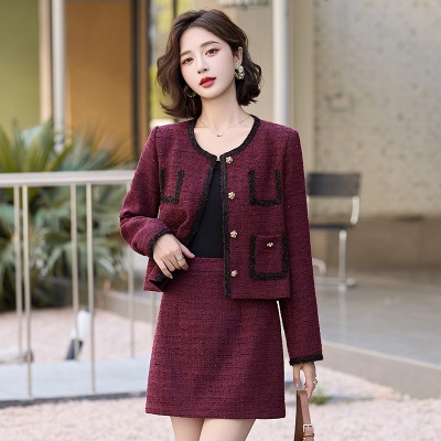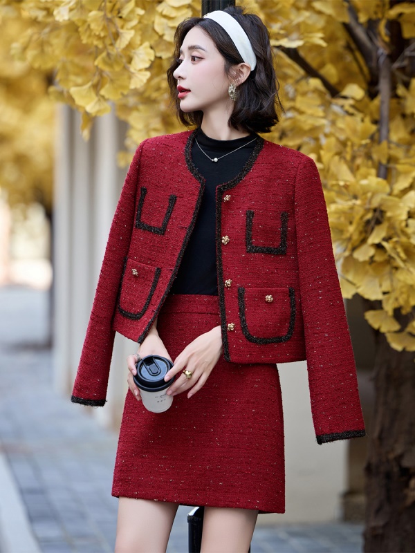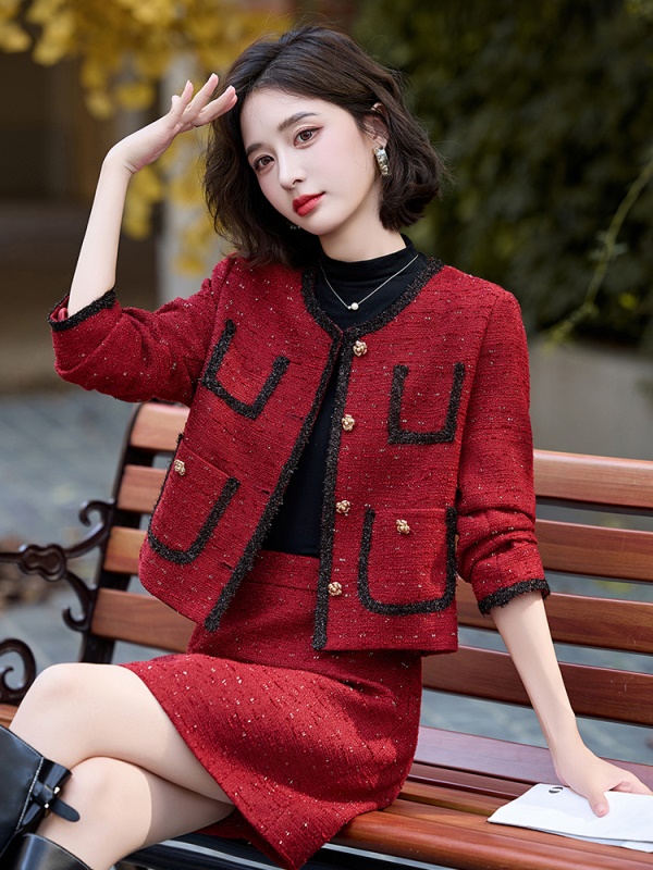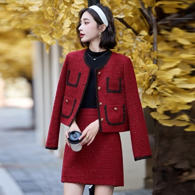 商品名称:法式小香风名媛套装女2025秋季新款复古花边红色喜庆婚宴两件套裙