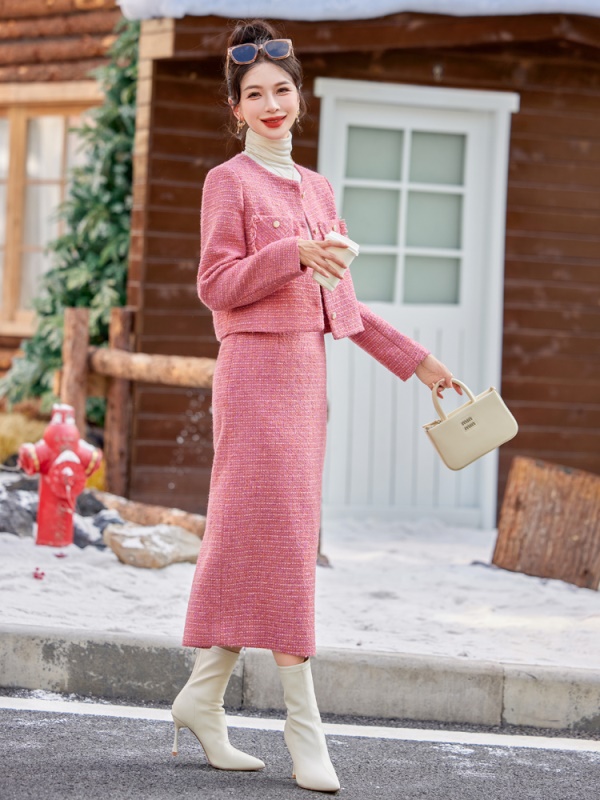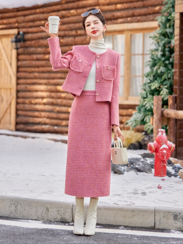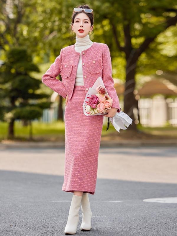 商品名称:粉色小香风毛呢套装女2025秋冬新款欧货时尚显瘦高个子加厚两件套