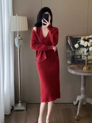 小香风红色针织套装女秋季2025新款时尚气质高级感毛衣裙子两件套