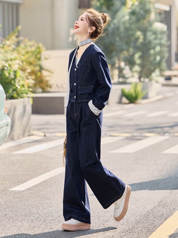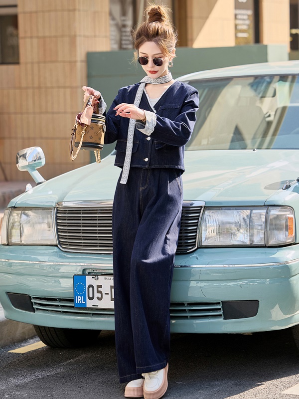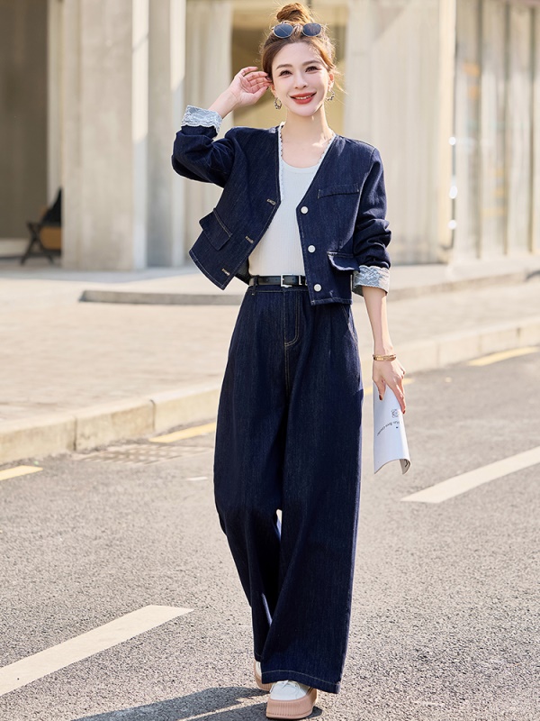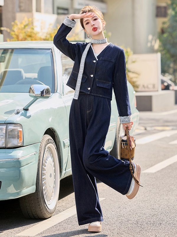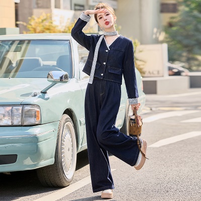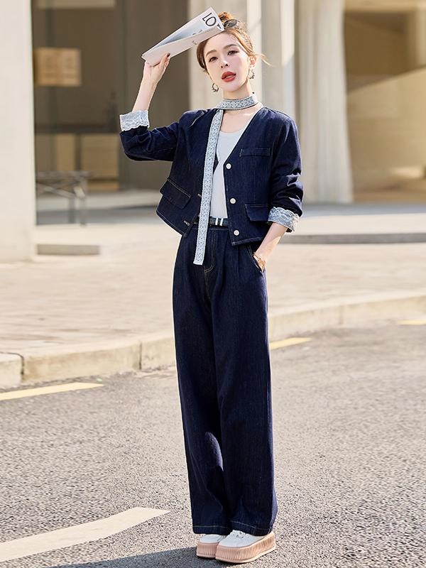 商品名称:小香风牛仔套装女2025春新款高级感气质拼接蕾丝阔腿裤穿搭两件套
