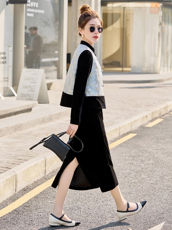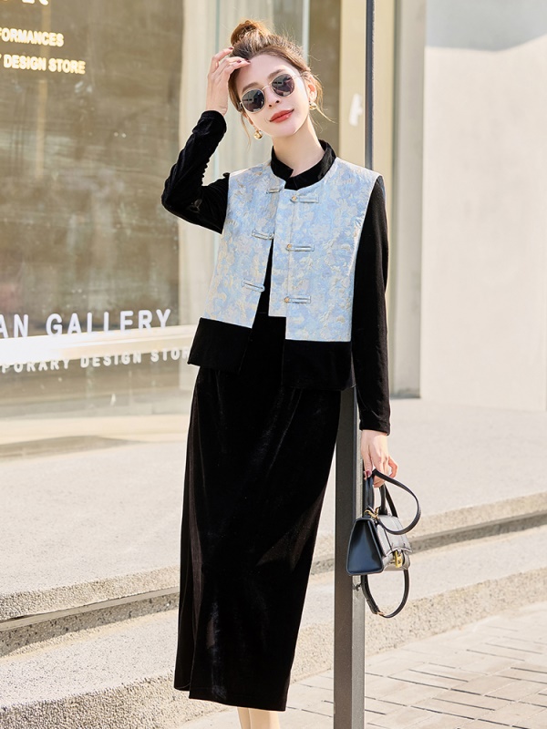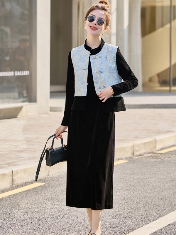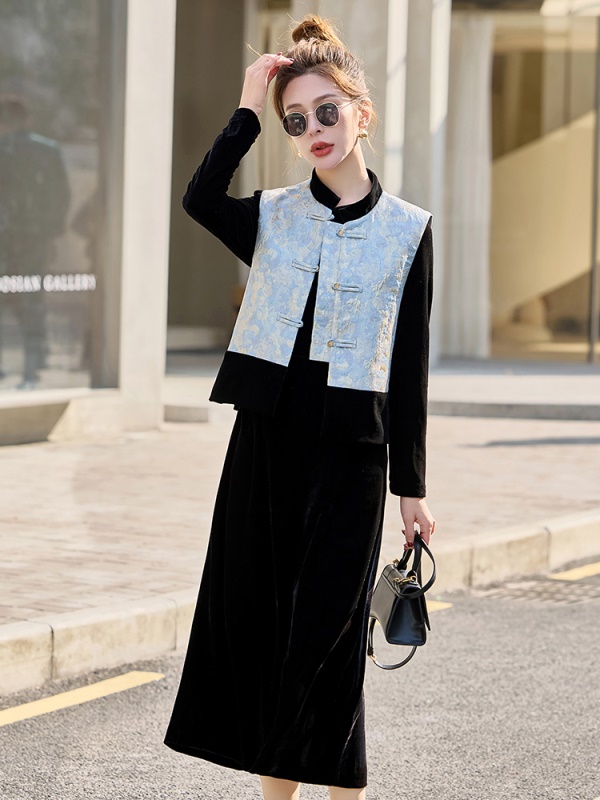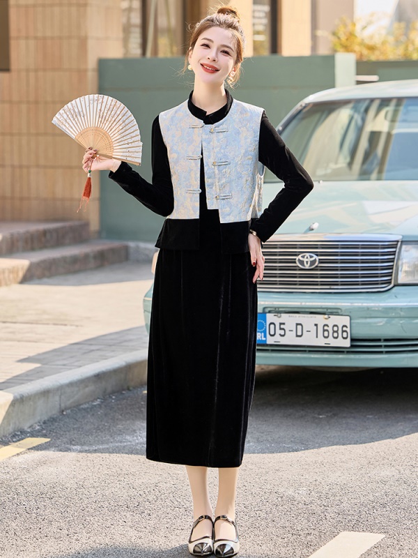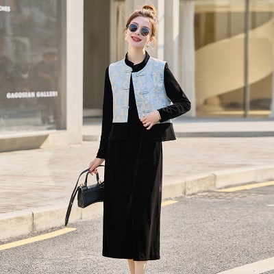 商品名称:新中式国风套装女春季2025新款高级感马甲金丝绒连衣裙穿搭两件套