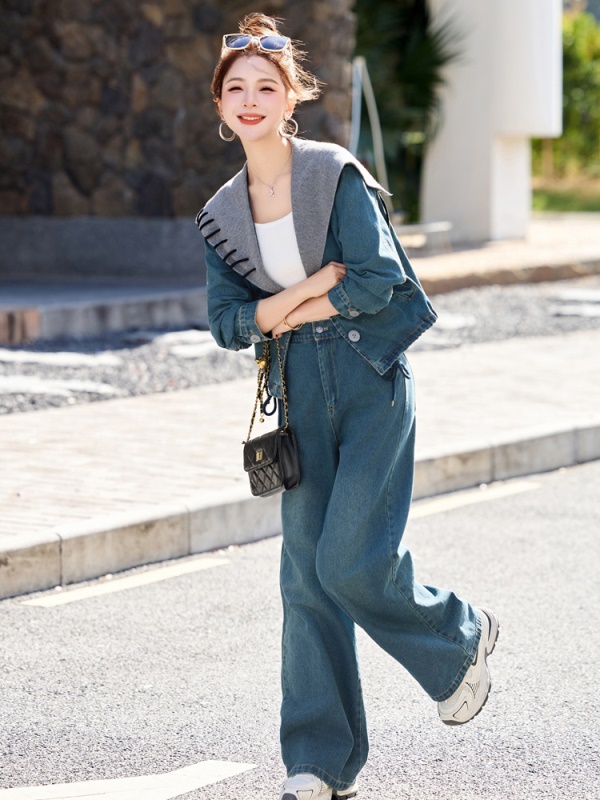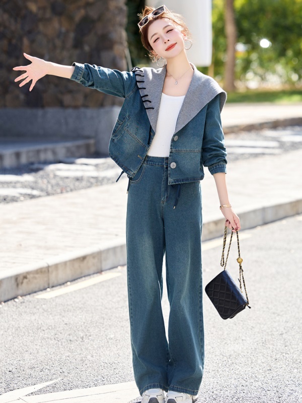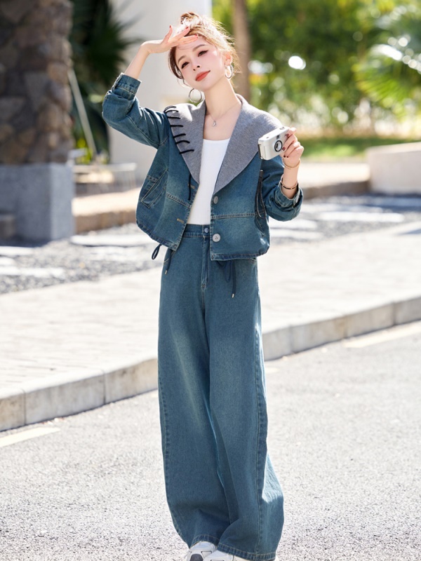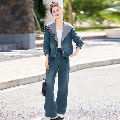 商品名称:开春穿搭大翻领牛仔套装女2025春秋新款超火气质时尚显瘦两件套裤