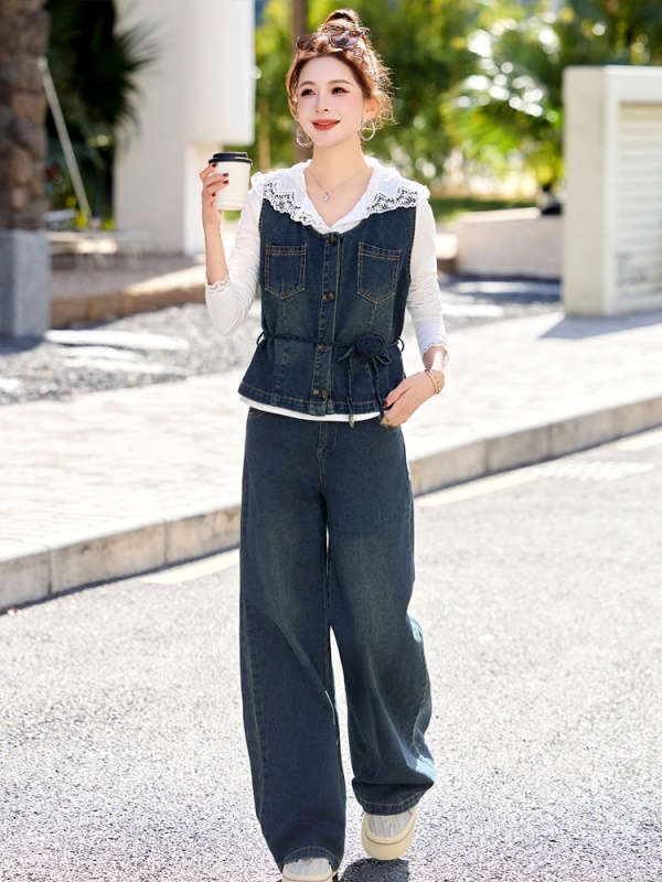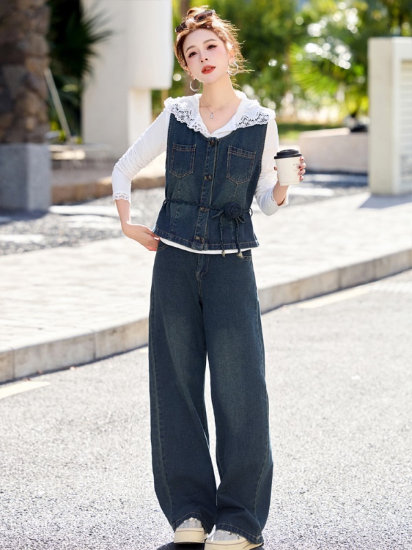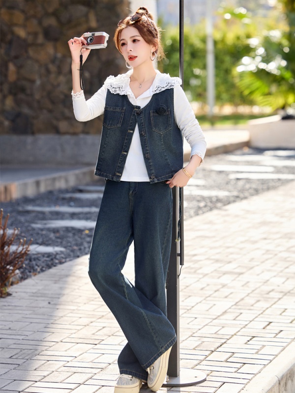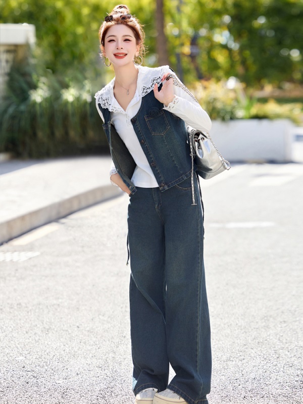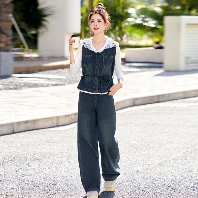 商品名称:欧货今年流行工装风套装女2025春季新款高级设计感牛仔马甲三件套