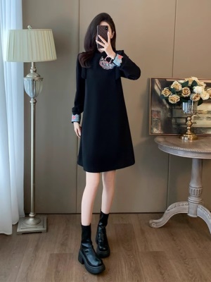 高级感新中式黑色国风连衣裙女秋冬加绒复古气质高端刺绣小黑裙子