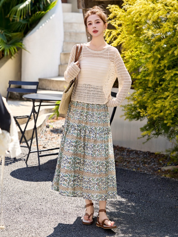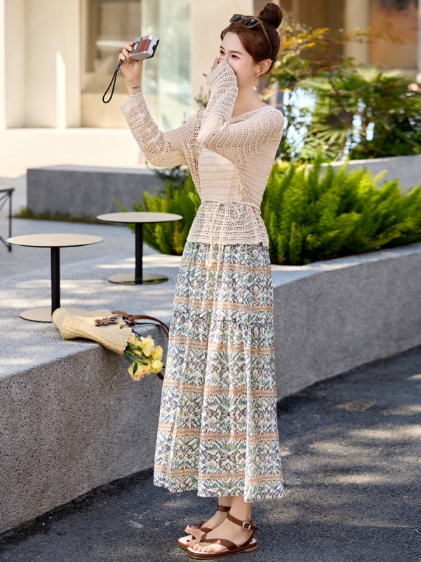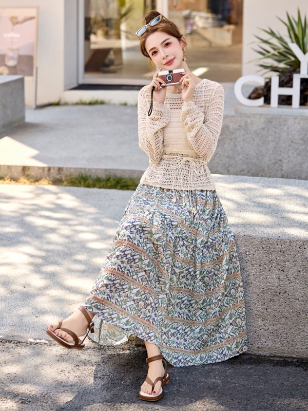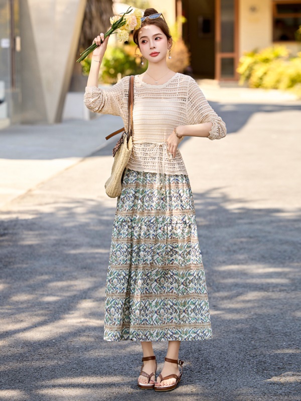 商品名称:波西米亚时尚套装女夏2025新款气质镂空罩衫搭配印花半身裙三件套