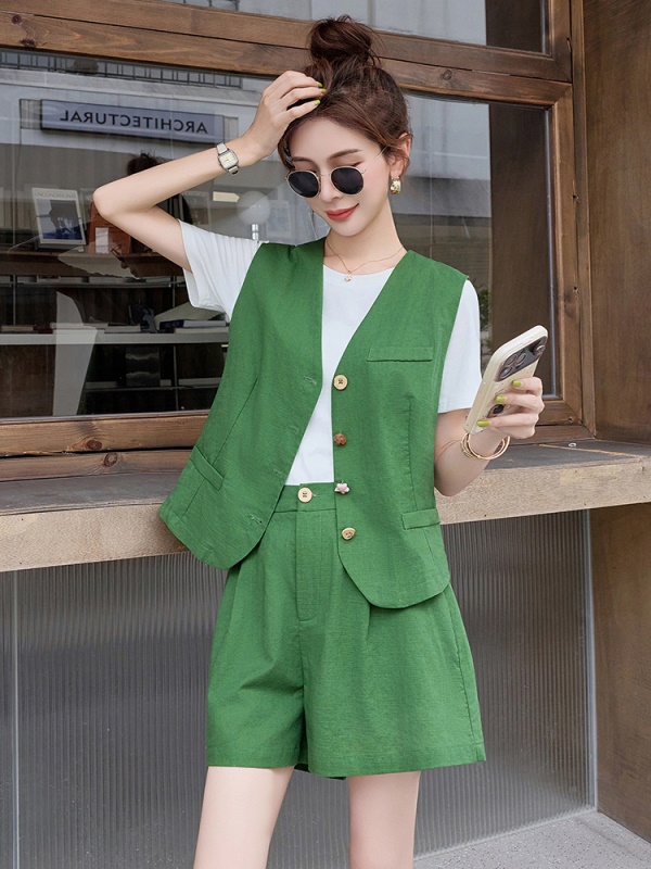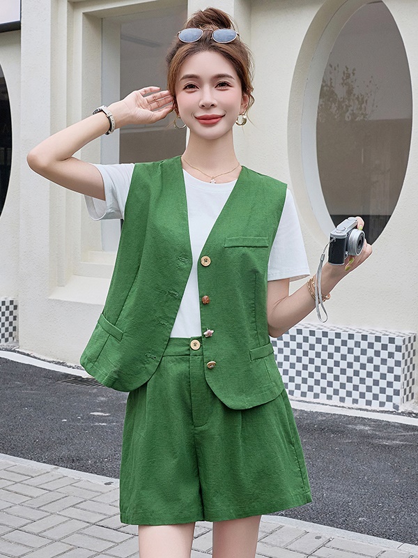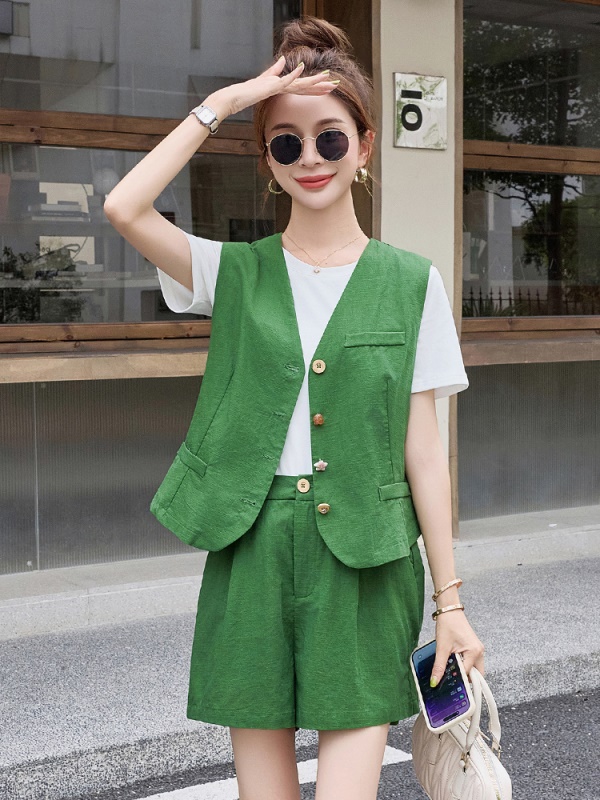商品名称:欧货亚麻西装马甲套装女夏2025新款休闲巨好看显瘦遮肉短裤三件套