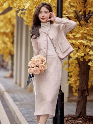 粉色法式小香风套装女2025秋冬新款时尚洋气爆款加厚羊毛呢两件套