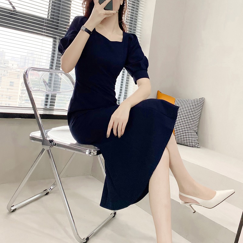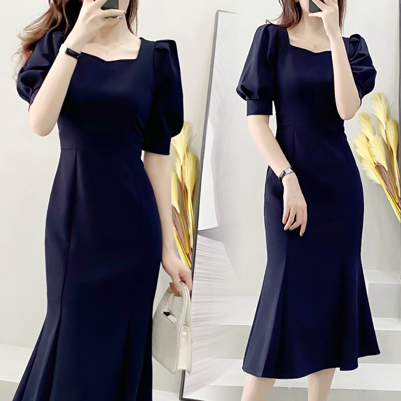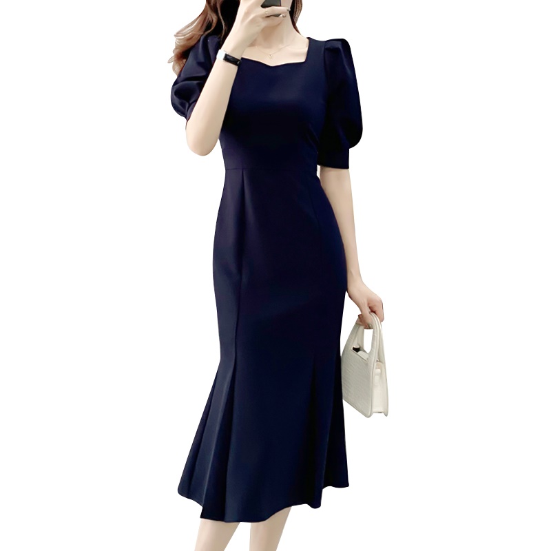 商品名称:连衣裙夏收腰显瘦泡泡袖鱼尾裙礼服裙轻奢小众高端中长款过膝长裙