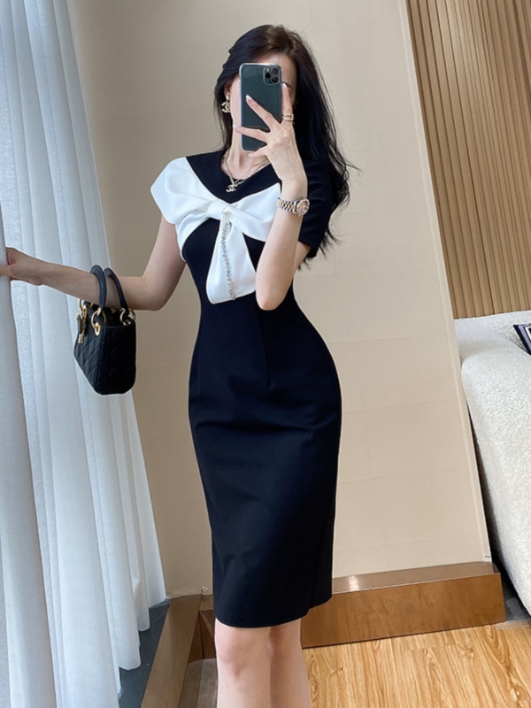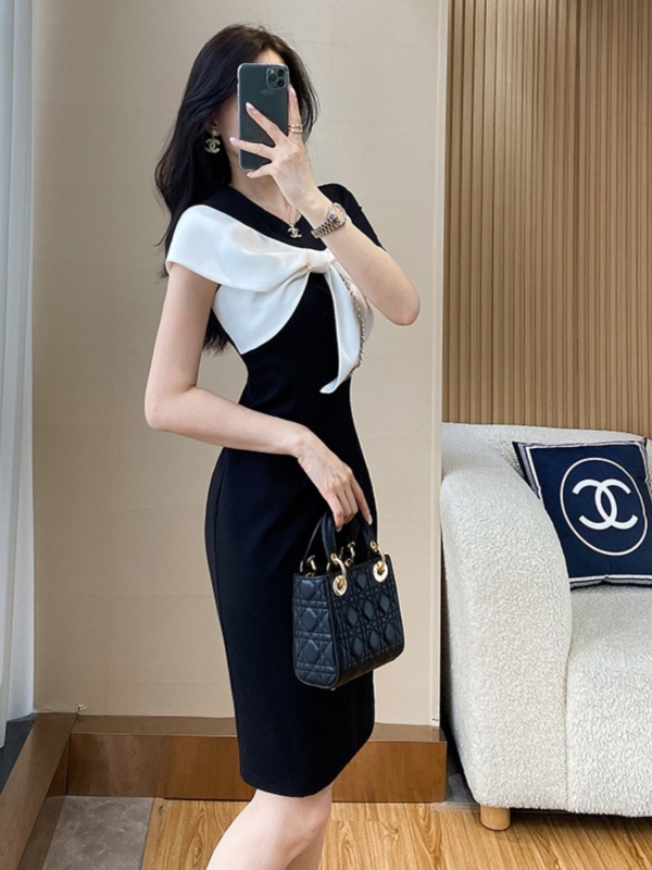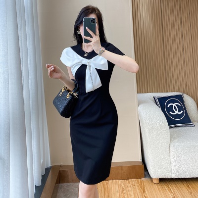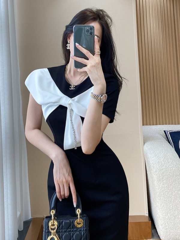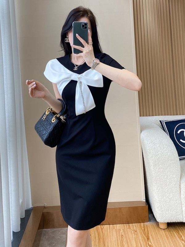商品名称:夏2025新款气质礼服连衣裙蝴蝶结修身收腰显瘦黑色包臀短裙小个子