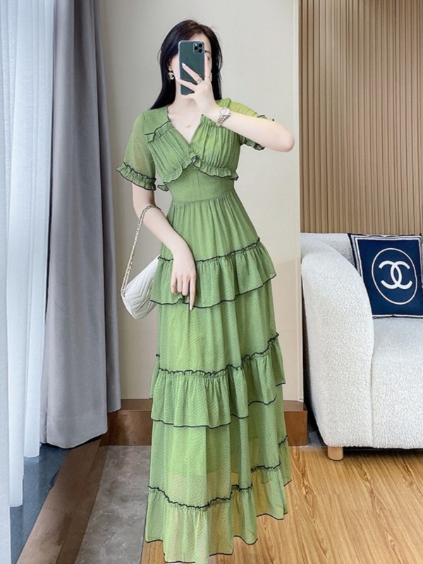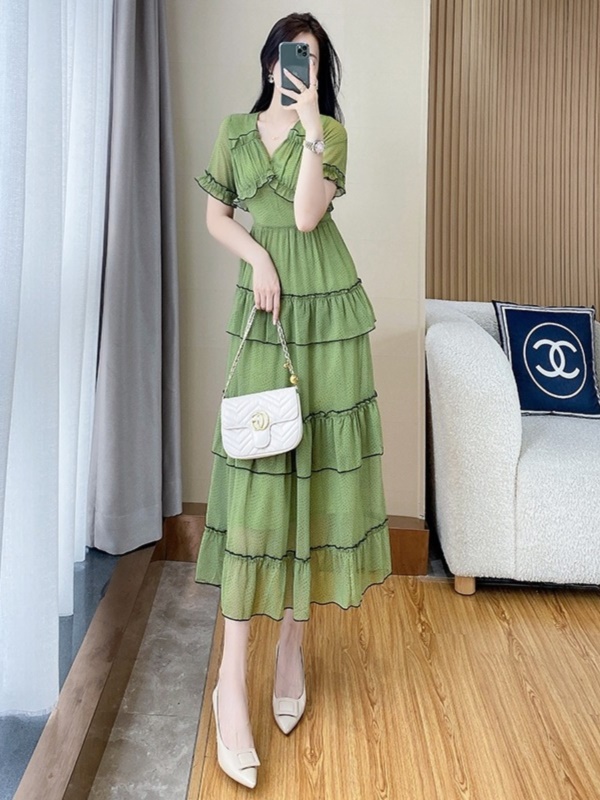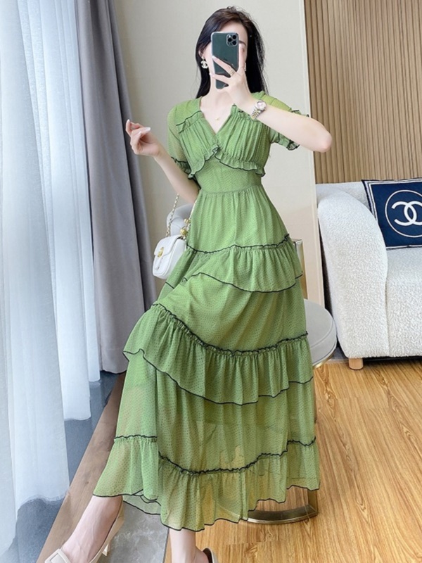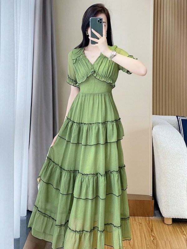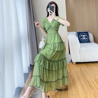 商品名称:法式高级感雪纺淡绿色连衣裙女仙2025夏季新款度假气质蛋糕长裙子