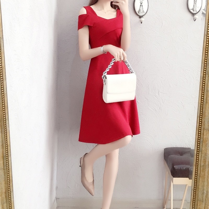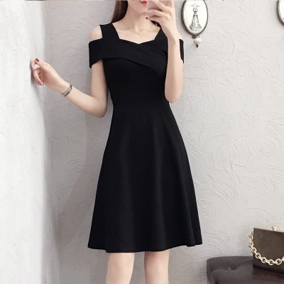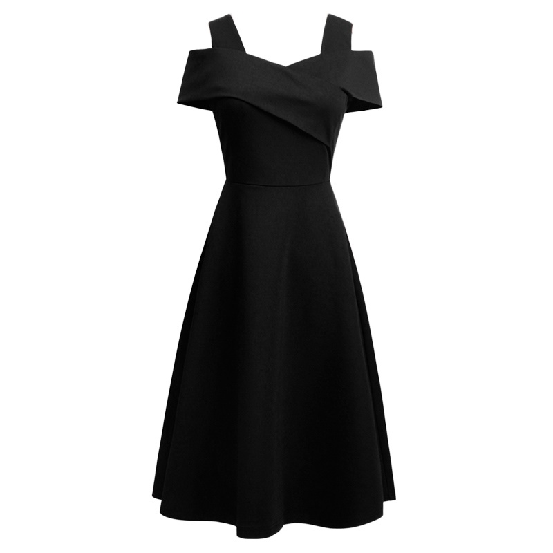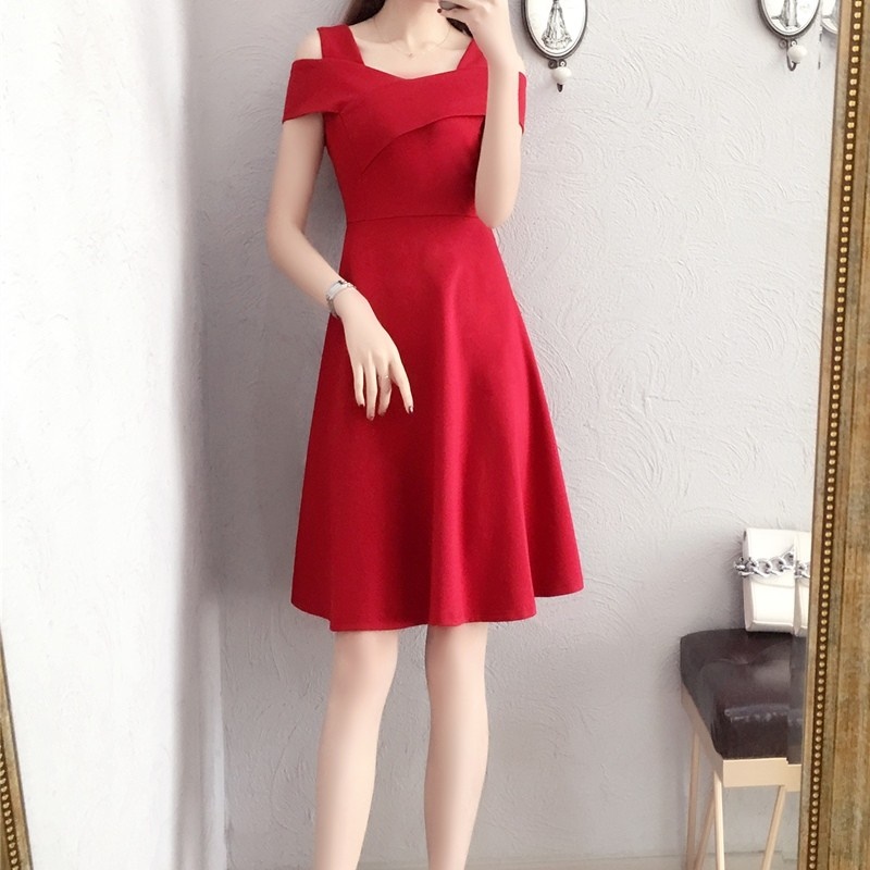 一字领露肩连衣裙女夏季小黑裙赫本风修身收腰显瘦红色小礼服个子