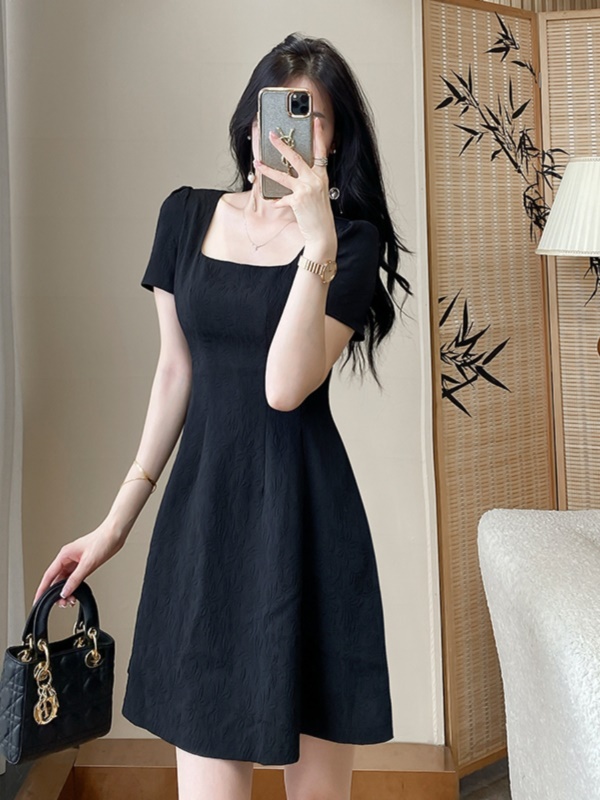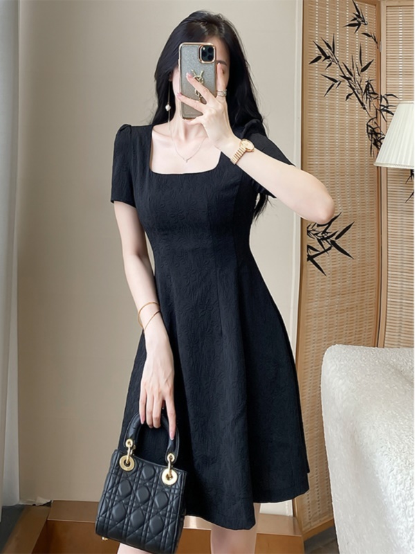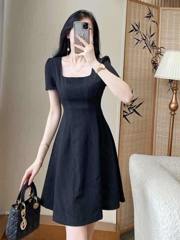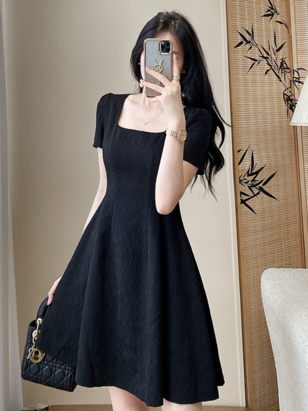 2025新款法式气质方领黑色连衣裙子女装夏季显瘦小个子蓬蓬小黑裙