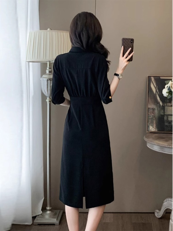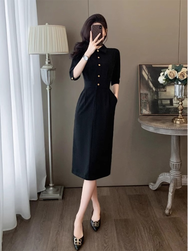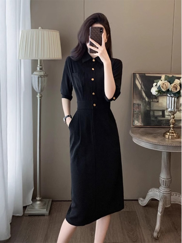 黑色法式polo休闲连衣裙女夏季收腰显瘦气质通勤赫本风衬衫长裙子