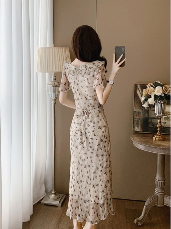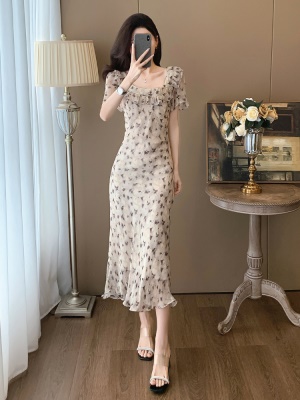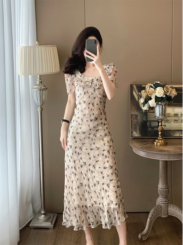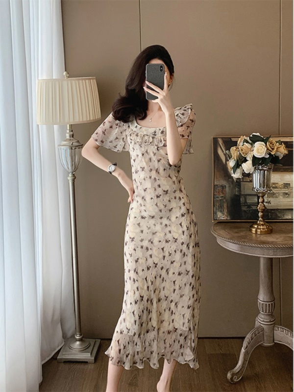 法式复古高级感方领雪纺连衣裙女夏季2025新款绝美仙气碎花长裙子