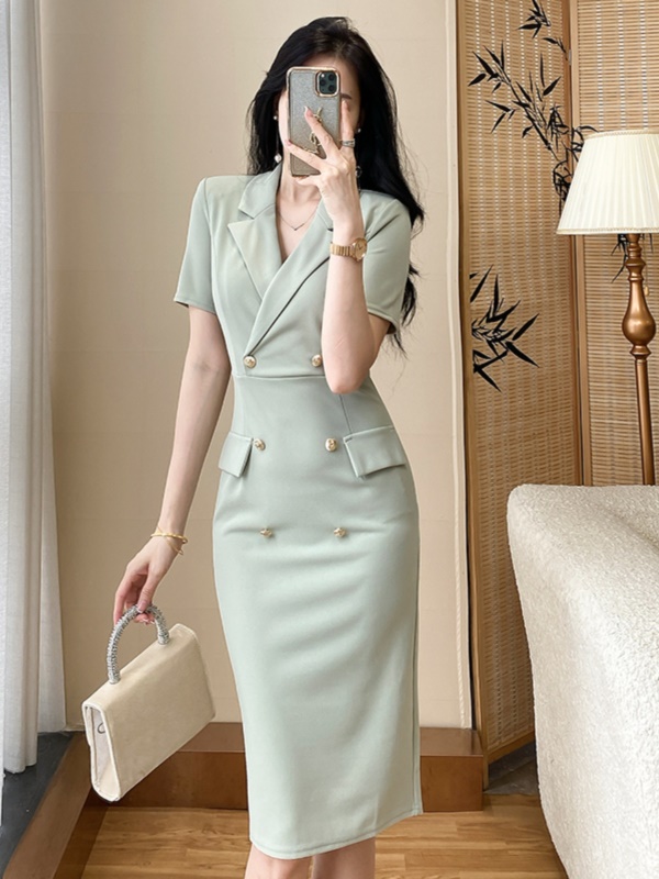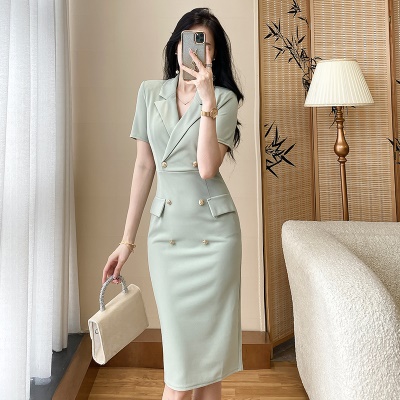 2025夏季豆绿色西装连衣裙气质女神范高级感时尚减龄职场通勤女装