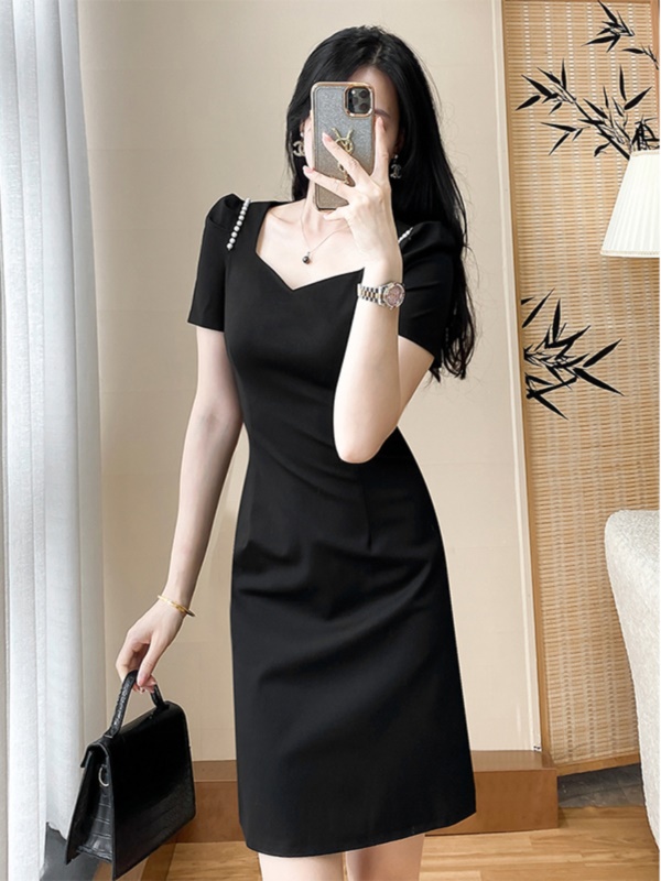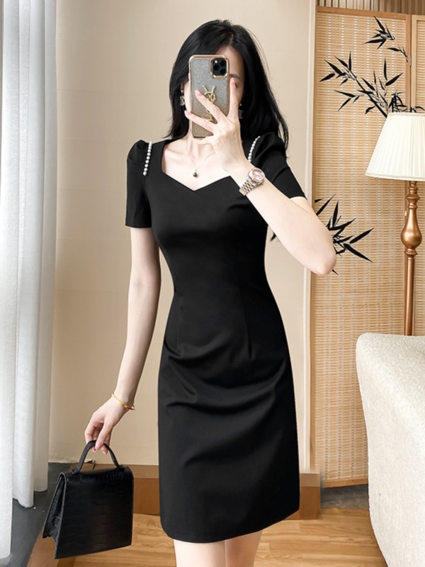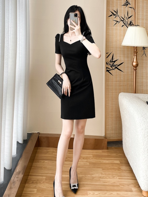 赫本风气质修身包臀职业连衣裙女神范轻奢显瘦v领小黑裙夏高级感