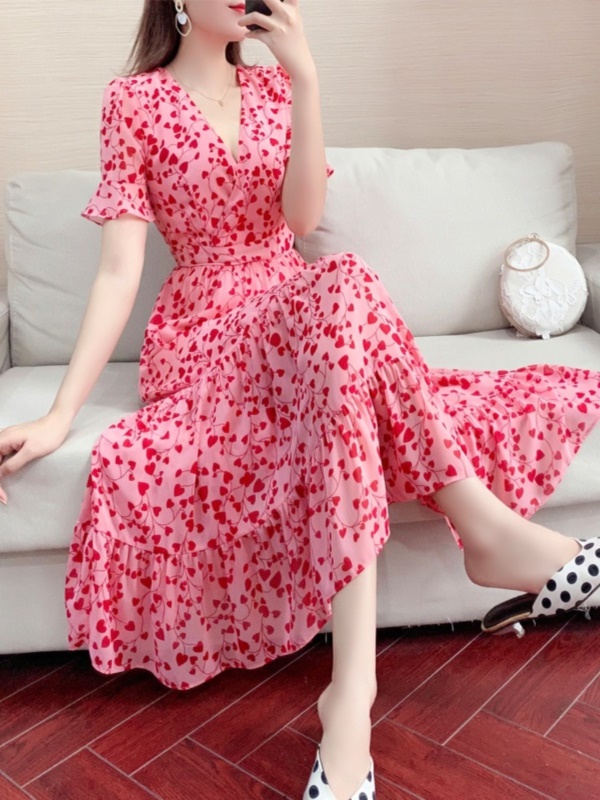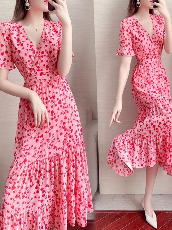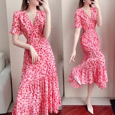 短袖V领碎花连衣裙女夏收腰显瘦气质超仙女雪纺长裙2025夏季新款