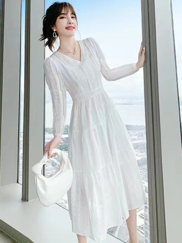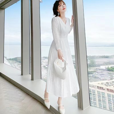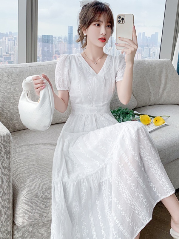 2025新款白色短袖连衣裙V领春夏季修身气质高级感仙女纯棉长裙子