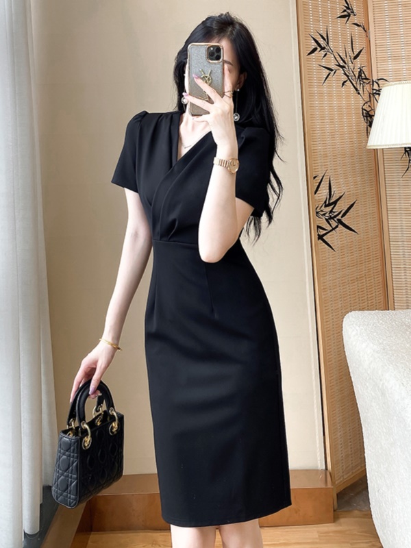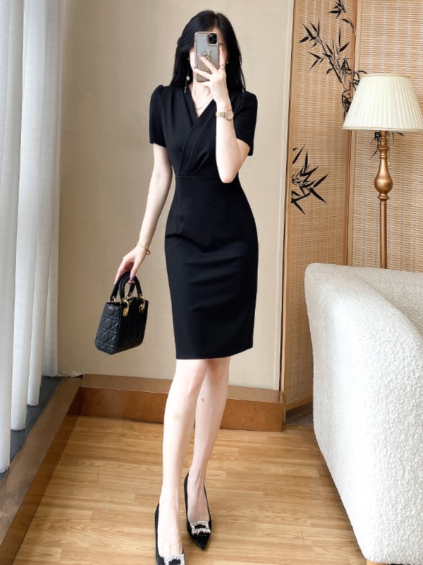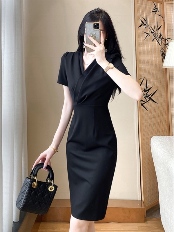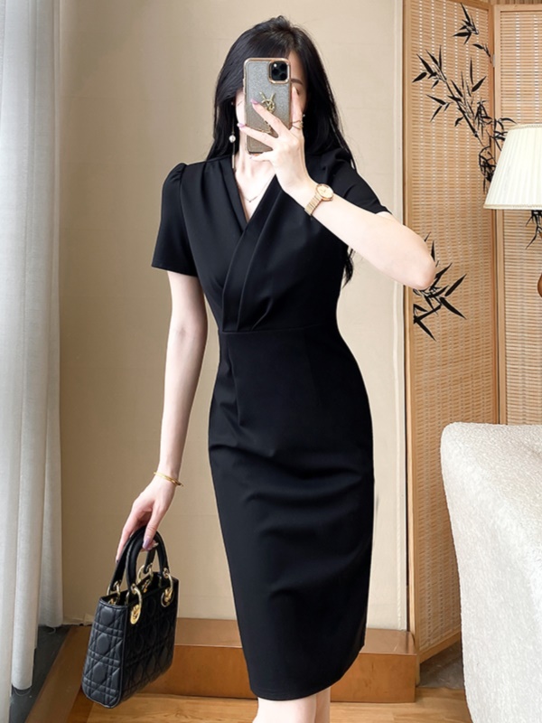 气质包臀V领连衣裙高级感干练职业装短裙女神范修身显瘦小黑裙夏
