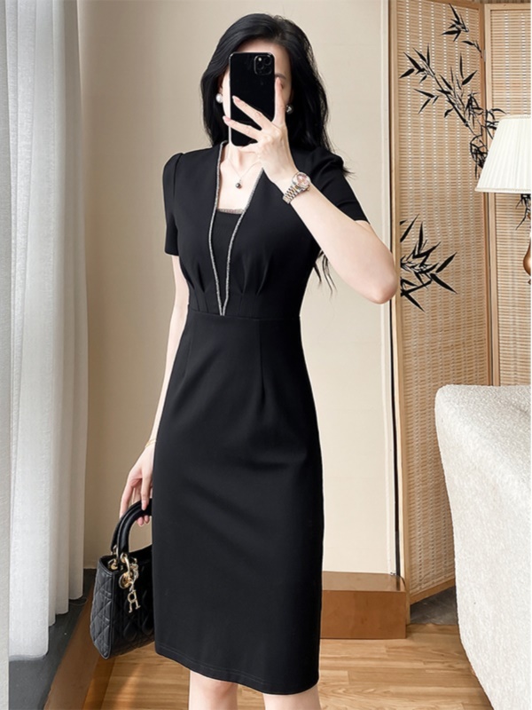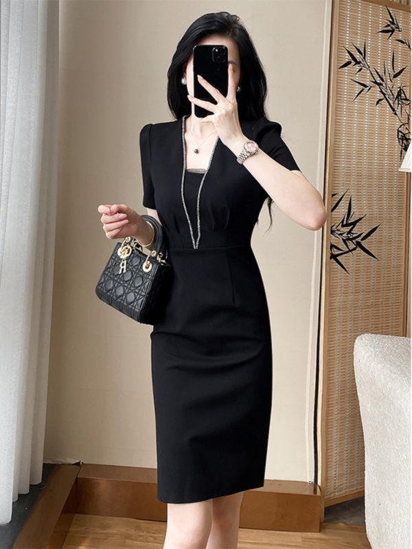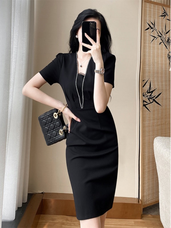 赫本风气质修身包臀职业连衣裙女神范轻奢显瘦v领小黑裙夏高级感