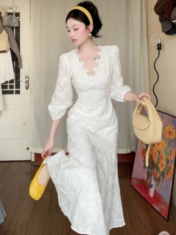 法式高级感绝美刺绣蕾丝连衣裙白色v领鱼尾长裙子女春夏2025新款