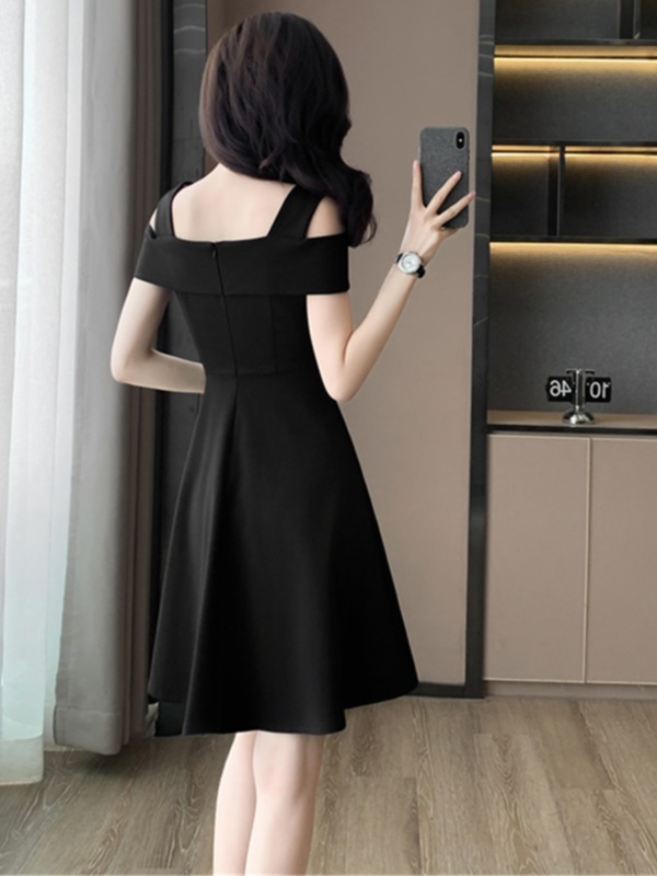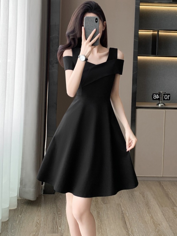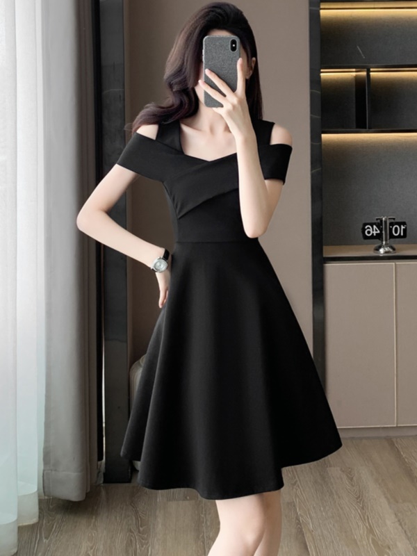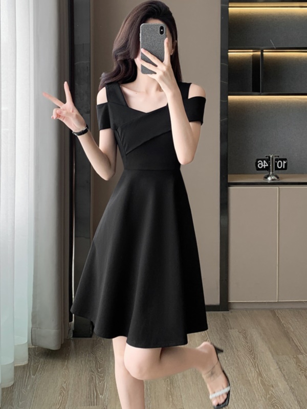 赫本风黑色修身显瘦连衣裙2025夏季小个子高级感露肩吊带小黑裙子