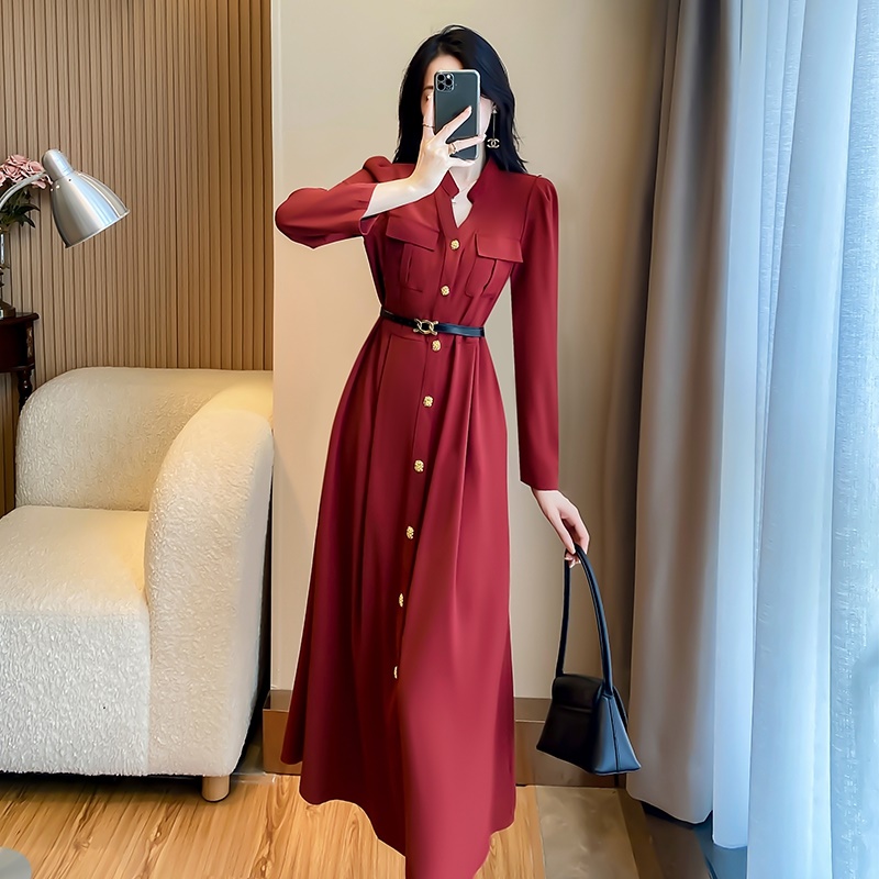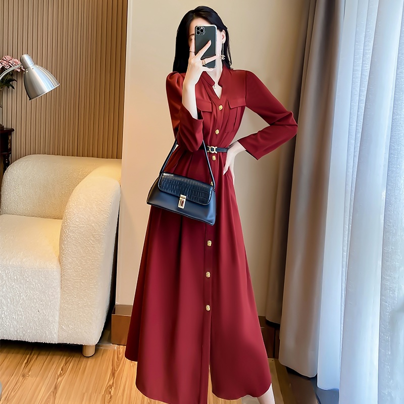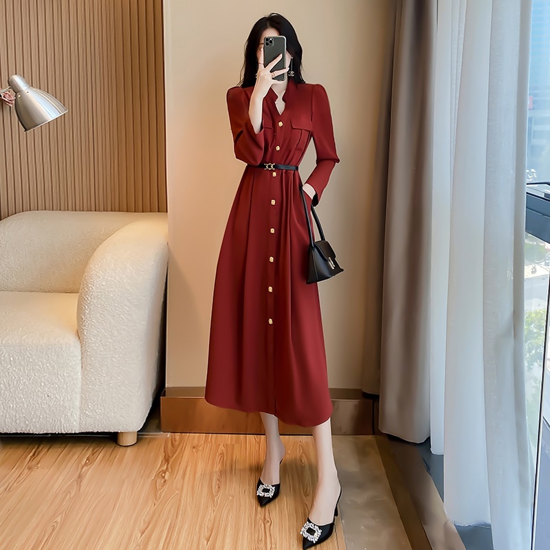 秋季新款红色连衣裙日常高级感女装气质收腰女神范长袖衬衫长裙子