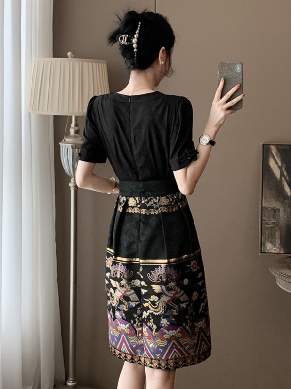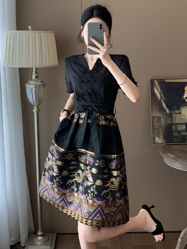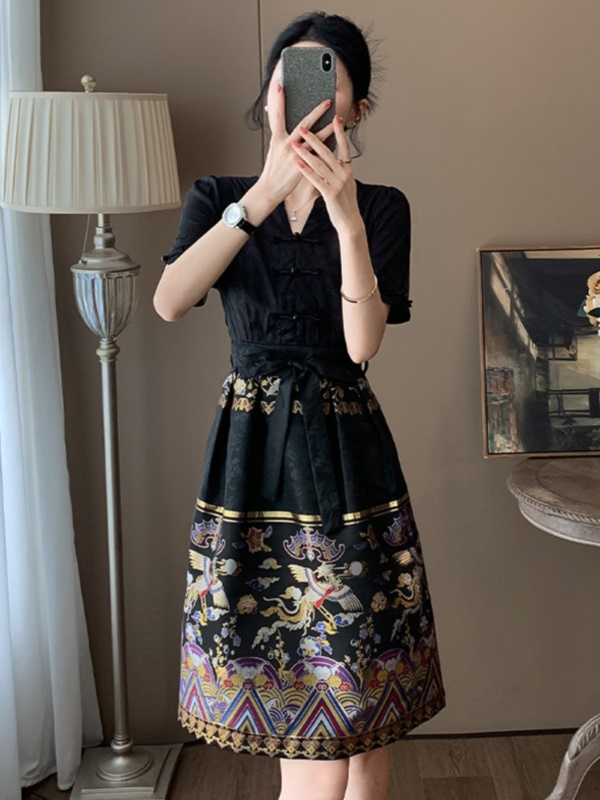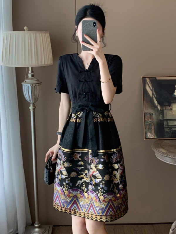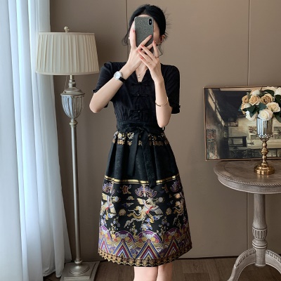 商品名称:高端黑色新中式V领连衣裙女夏季国风2025新款气质刺绣改良马面裙