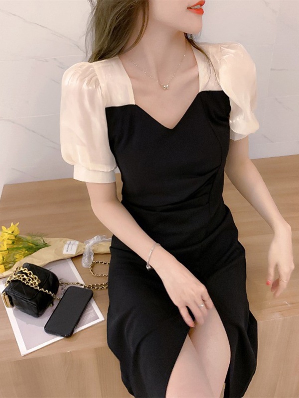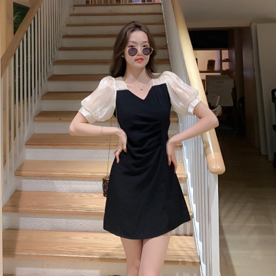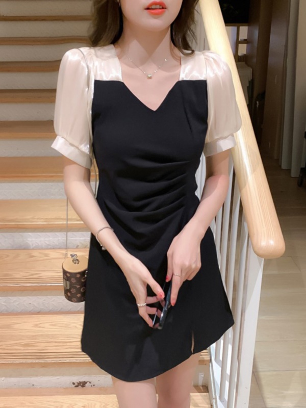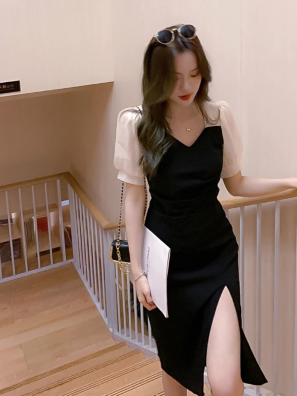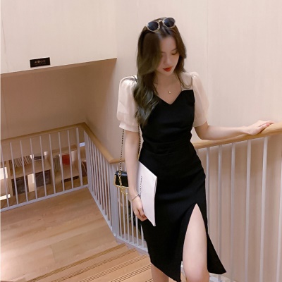 赫本风黑色开叉v领连衣裙夏季高级感法式包臀收腰修身显瘦小黑裙