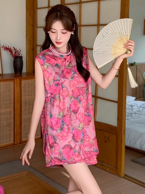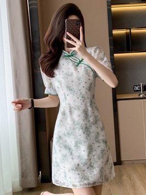 高级感国风短袖碎花连衣裙小个子气质收腰显瘦改良旗袍裙子女夏天
