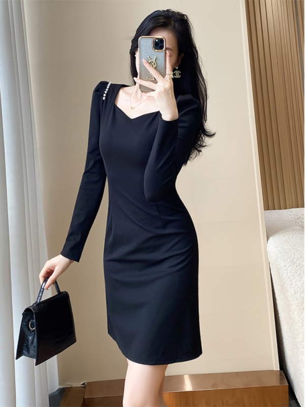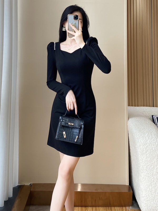 法式黑色针织连衣裙女秋冬季收腰显瘦气质修身赫本风打底毛衣裙子
