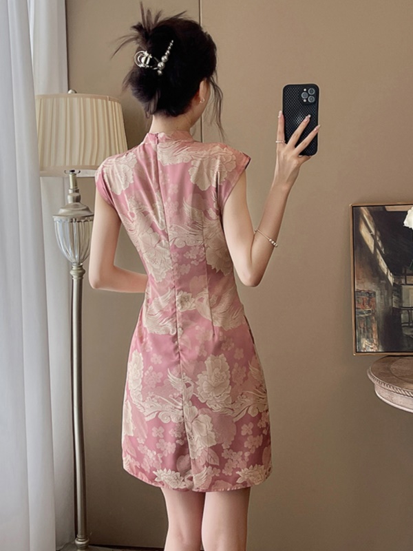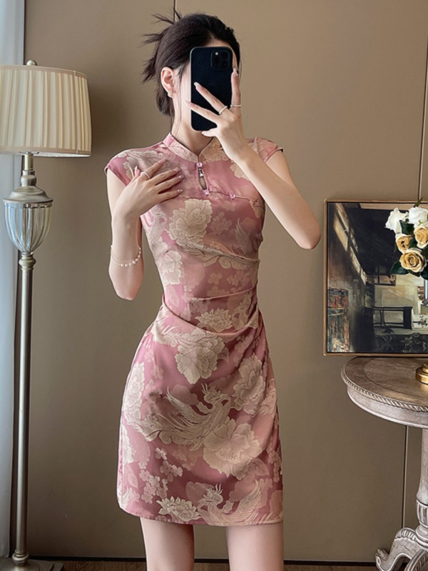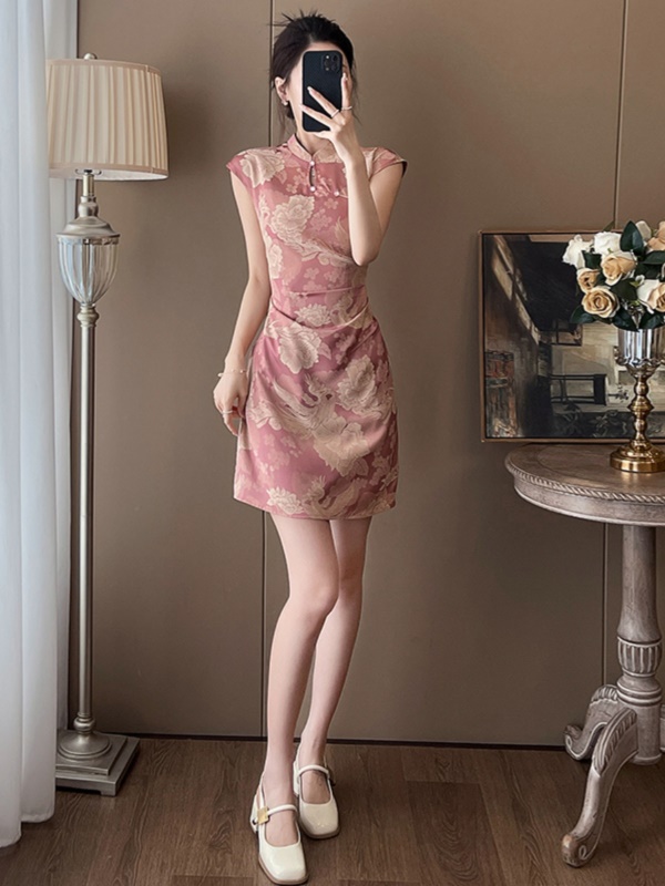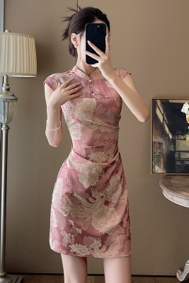 新中式国风改良旗袍裙女夏复古立领洋气减龄褶皱显瘦连衣裙小个子