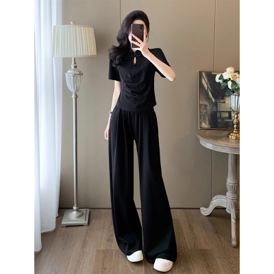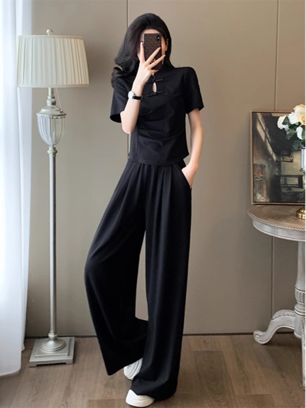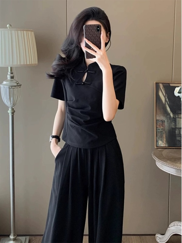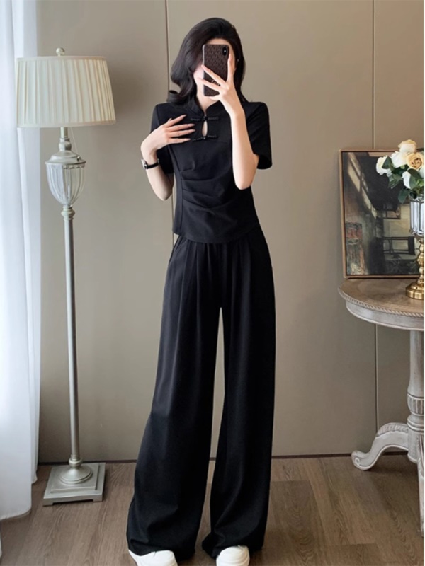 商品名称:新中式国风休闲运动套装女夏季2025新款修身旗袍上衣阔腿裤两件套