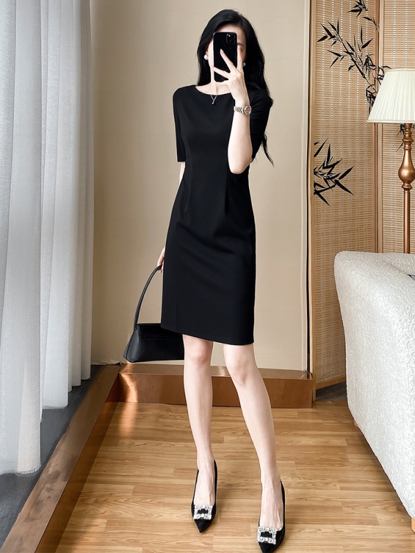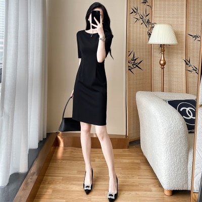 高端质感黑色修身显瘦中袖连衣裙2025新款早秋女气质OL职业包臀裙